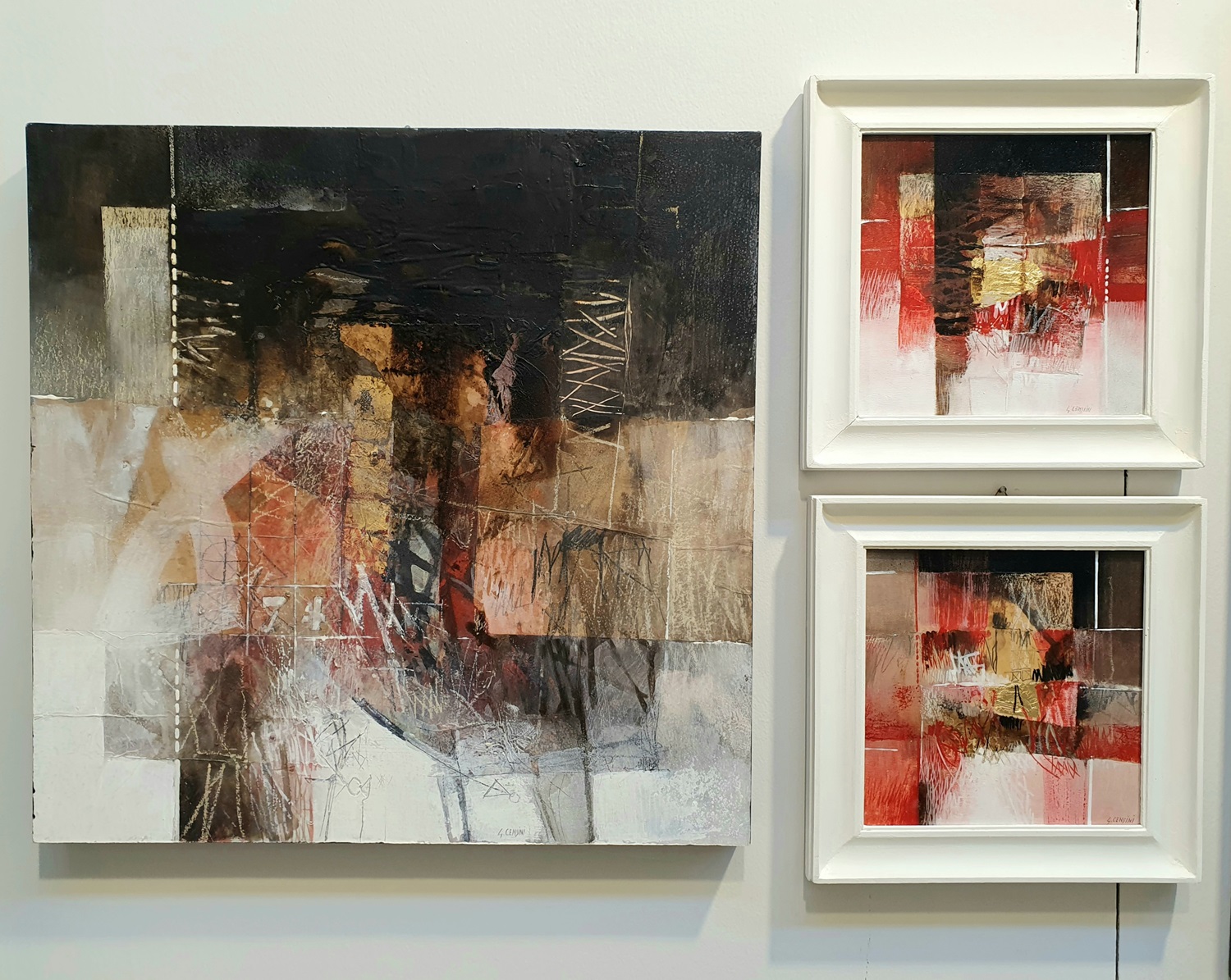 In “Itinerari plurimi” i colori tipici del linguaggio “censiniano” ci sono tutti. La passionalità e la forza ardente dei rossi, la spiritualità dell’azzurro, il bianco come voglia di ripartire, equilibrio e purezza, i marroni di Madre Terra e infine l’oro, da sempre cuore alchemico delle composizioni del pittore, attorno al quale convogliano la materia e le altre cromie.