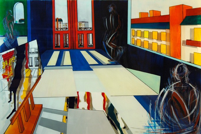 Linguaggio pittorico che richiama l’impressione fotografica, sottili tratti che immediatamente imprigionano veloci figure umane senza volto, cellule vive nel proprio rapido moto dal sapore futurista, sospese tra gialli, violacei echi metafisici di atmosfere e architetture silenti. Spazi teatrali che assistono all’effimera evanescente avventura umana.