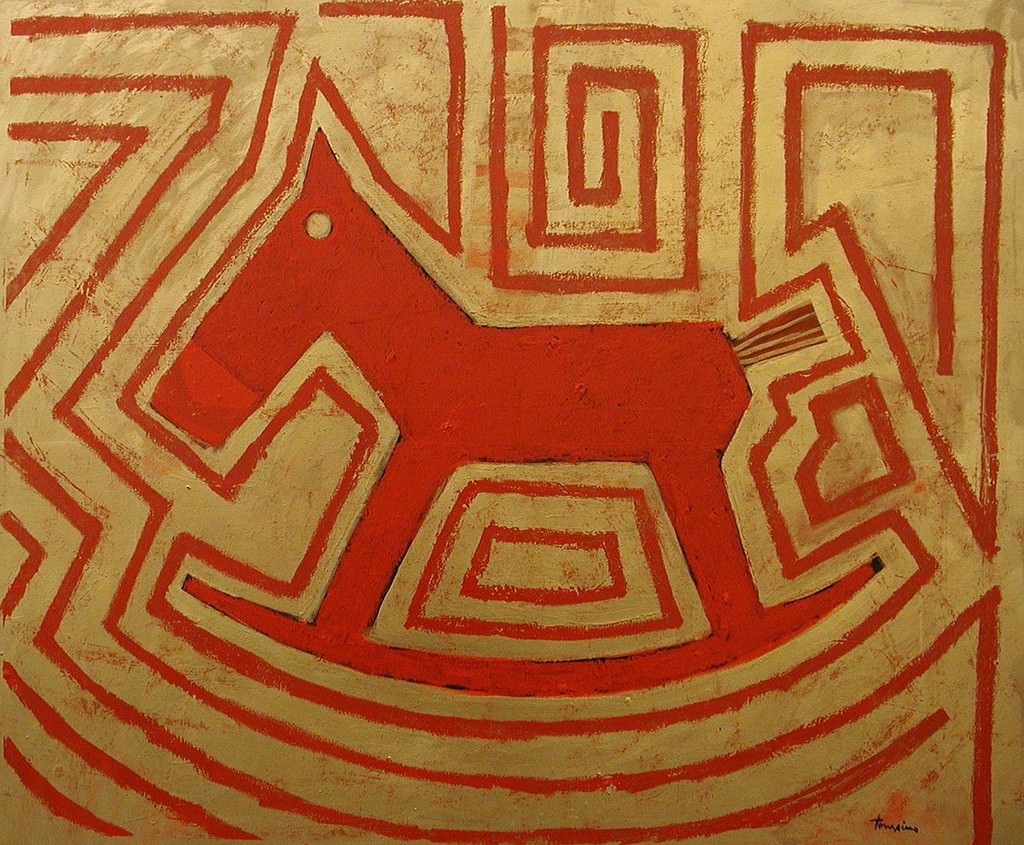Il cavallo a dondolo, rievoca l’infanzia perduta, il ritorno al passato, un gioco, che diventa simbolo d'affetti materni ma anche simbolo di equilibrio instabile. Uno dei giochi per bambini più antichi del mondo ma che ancora riesce a infondere illusione e meraviglia. Un tentativo da parte dell’artista di ricercare quell’istintività innocente dei bambini, che fa sognare. Una pittura primordiale, segnica, fatta di simboli semplici.
