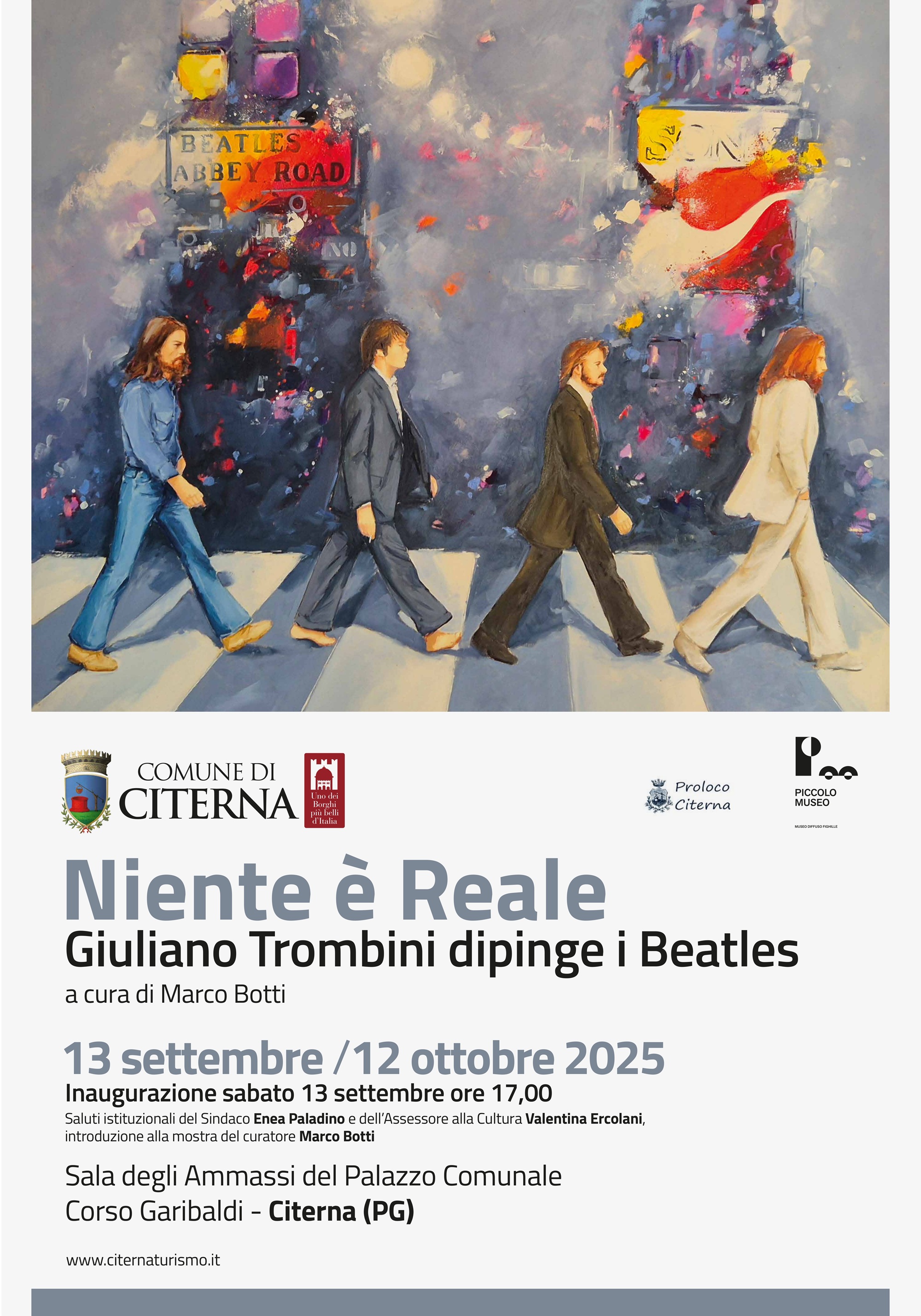 CITERNA - Dal 13 settembre al 12 ottobre 2025 la Sala degli Ammassi, in Corso Garibaldi 26/30 a Citerna, ospita “Niente è reale. Giuliano Trombini dipinge i Beatles”, personale di pittura di Giuliano Trombini a cura di Marco Botti.