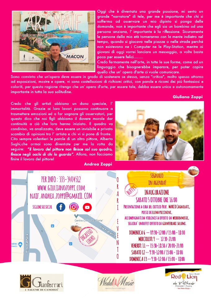 Il comune patrocinante di Traversetolo (PR) appoggia l’iniziativa culturale proposta da Andrea Zoppi figlio dell’artista Giuliano Zoppi, che ha preparato un evento con grande cura sotto tutti gli aspetti, che mira a ricordare l’ ultimo ventennio di produzione artistica nazionale e internazionale del noto padre attraverso un percorso tra Naif e Surrealismo, in cui Zoppi ha ottenuto importanti riconoscimenti.
