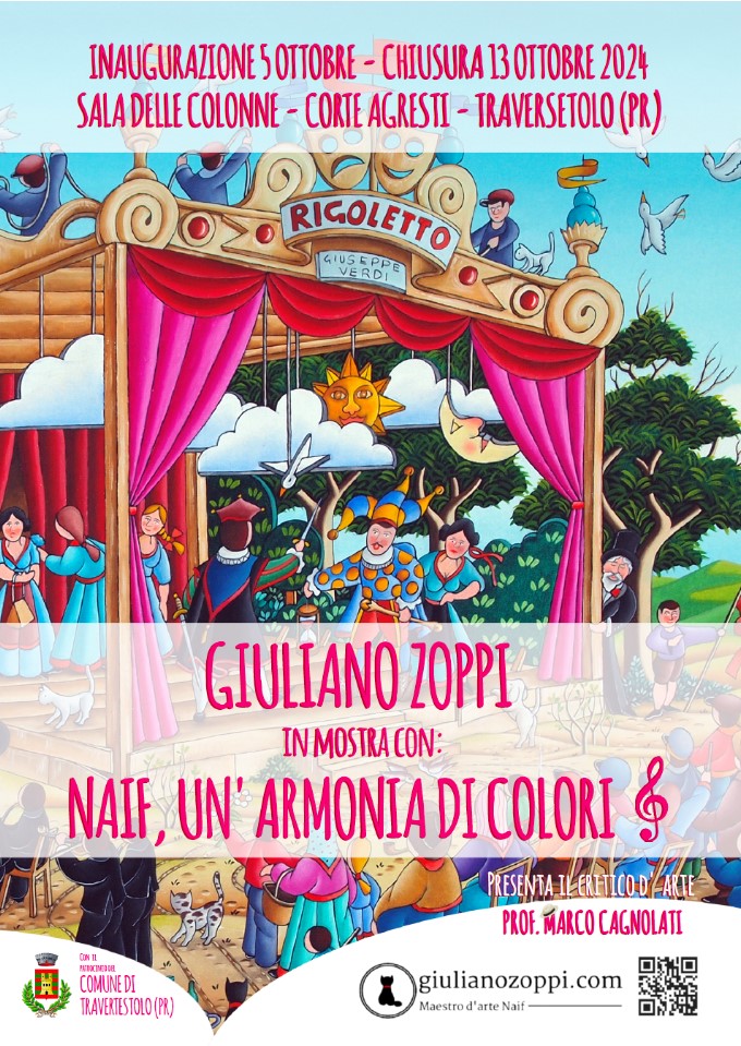 Mostra dei capolavori del pittore naïf Giuliano Zoppi, l’ inaugurazione sarà Sabato 5 Ottobre 2024 alle ore 16:30 presso Corte Agresti in Via F.lli Cantini a Traversetolo (PR) ci sarà musica di violino, poesie ed un progetto didattico con circa 100 alunni/e, un evento aperto a tutti. Ti aspettiamo!
