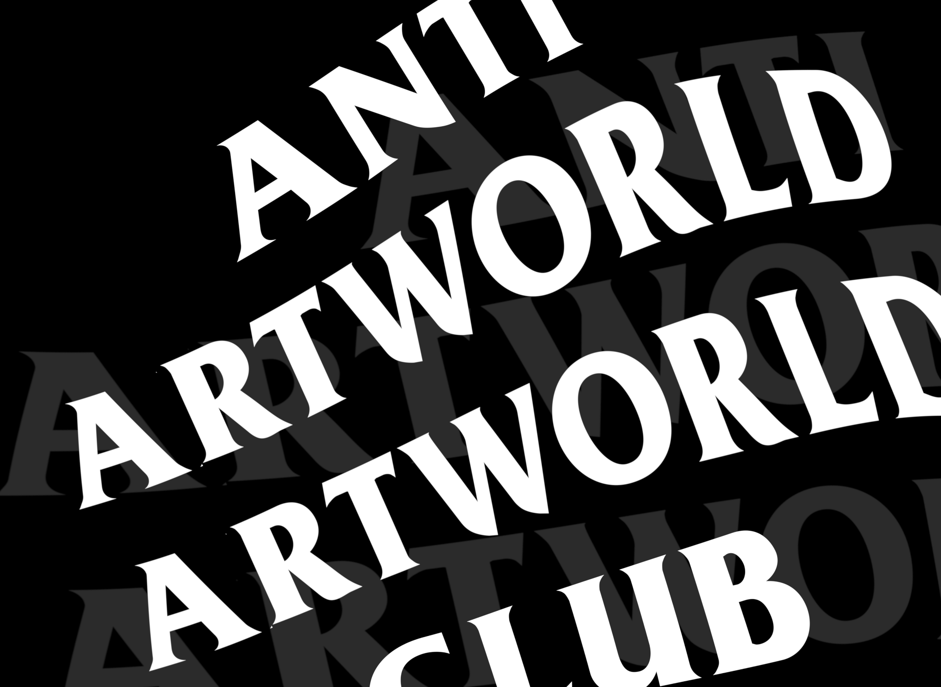 ANTI ARTWORLD ARTWORLD CLUB - si pone come osservatore interno del sistema dell’arte contemporanea italiana, evidenziandone con sagacia le dinamiche e le contraddizioni attraverso la messinscena di una serie di oggetti che si presentano più come merchandising che manufatti artistici; si ribadisce qui la tendenza alla categorizzazione autoreferenziale del mondo dell’arte, che spesso si valorizza attraverso una brandizzazione commerciale. Andare contro ciò che va contro, finendo per inseguire la stessa direzione.