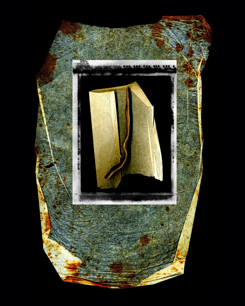 recuperate dall’archivio di famiglia, si sommano a elementi naturali, rappresentati da legni e alghe