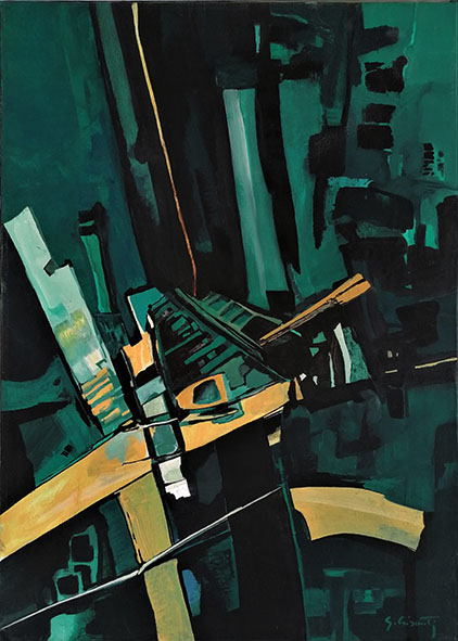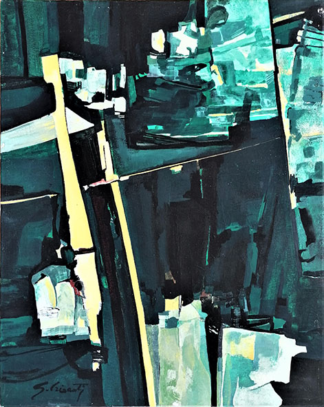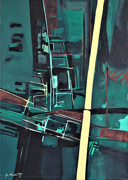 Volendo semplificare, negli anni Cinquanta in Italia ritroviamo due schieramenti culturali contrapposti, che vedevano da una parte gli artisti del socialismo realista, legati alla sinistra militante e dall’altra un gruppo più eterogeneo di autori, meno politicamente allineati, che guardavano soprattutto alle sperimentazioni segniche ed informali dell’Espressionismo Astratto americano. Opere queste, che negli anni Cinquanta e Sessanta cominciavano a circolare anche da noi. Nascevano così anche in Italia diversi movimenti legati all’Astrattismo Informale che si muovevano all’interno dell’Arte Materica, dell’Arte Segnica e dello Spazialismo. Ed è proprio in questo dibattito critico molto acceso e vivace che sicuramente il giovane Giulio si è formato.