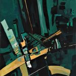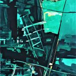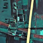 Penso inoltre che in particolare, e molto più da vicino, ha guardato al lavoro di Emilio Vedova e a quelle sue composizioni cariche di energia vitale che nel loro insieme sono percorse da linee aspre e taglienti. Un certo modo di campire per decise pennellate oblique, caratterizzate da neri profondi e alternate da squarci compositivi segnicamente definiti.