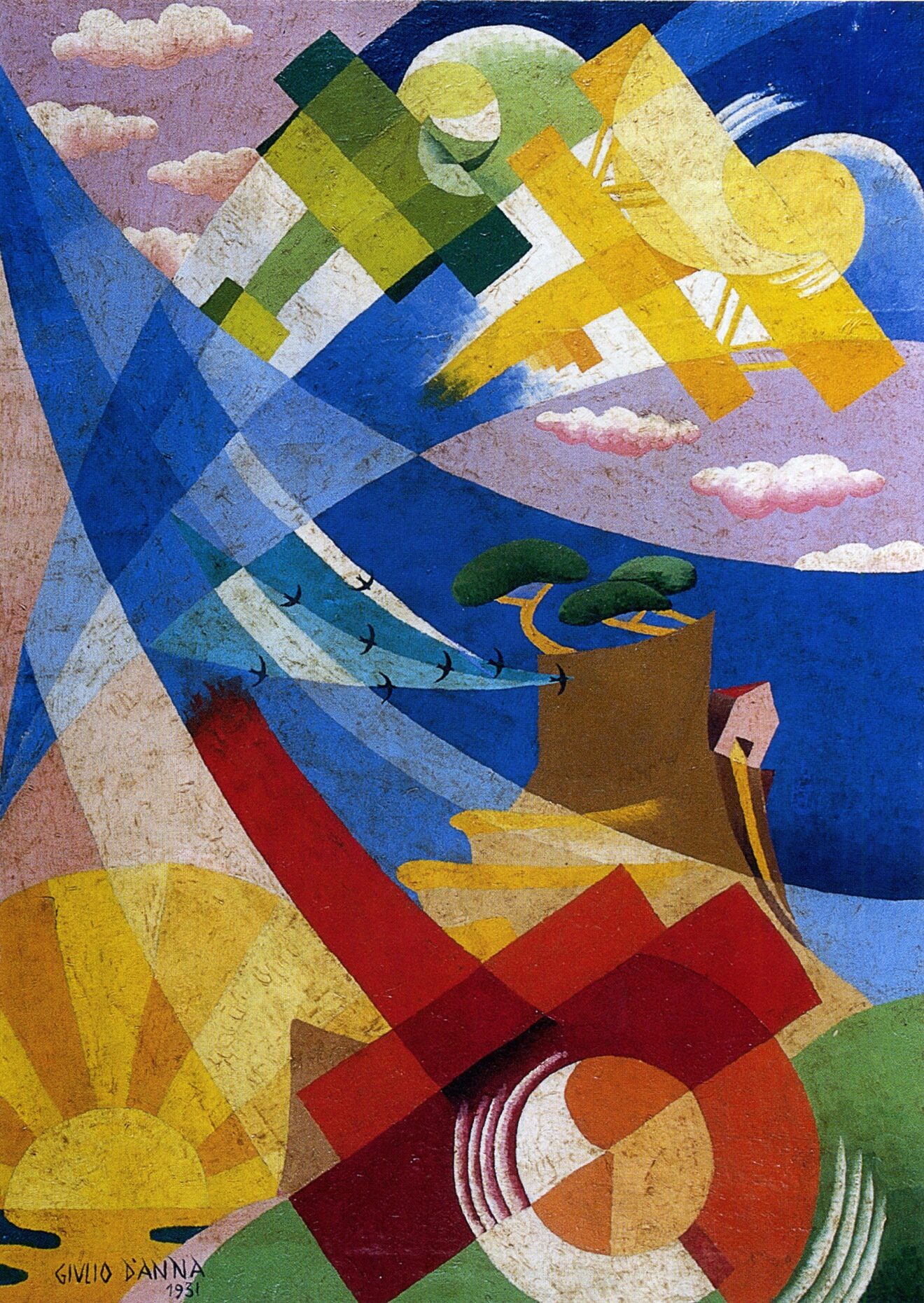 Ma che cos’è l’Aeropittura? Ce lo svela Maurizio Scudiero nel testo critico: «Una prima, immediata, risposta potrebbe indicare delle opere d’arte, di pittura, genericamente ispirate al volo, o all’aeronautica, dunque una corrente artistica d’ispirazione aviatoria. In realtà, se da una parte è vero che l’Aeropittura trae la sua prima ispirazione dal volo, essa non va però confusa con tutto ciò che, indistintamente, al volo s’ispira. In questo caso sarebbe solo una pittura di genere. Invece, per essere tale, un’opera di Aeropittura deve rientrare in alcuni precisi parametri operativi che sono stati codificati in un manifesto teorico e programmatico da parte di un nucleo di artisti firmatari, verso la fine degli anni Venti. Tutto ciò perché l’Aeropittura fu in pratica una filiazione del Futurismo, o, per la precisione, una sua metamorfosi. E le opere che ne risultarono contemplavano le mutevoli prospettive visive offerte dal volo, del tutto nuove e rivoluzionarie rispetto a quelle terrestri proprio per questa continua modificazione dei punti di vista che costringevano il pittore a ulteriori sintesi e trasfigurazioni. L’Aeropittura, in altri termini, fu il risultato di un’acquisita nuova sensibilità visiva. La terra è osservata dall’alto e, cosa ancora più interessante, è osservata dinamicamente, dunque in una continua successione di visioni mutevoli. Tutto ciò il pittore deve poi riversare sulla tela, ma aggiungendovi inoltre anche il senso di una nuova coscienza spirituale quale risultante psico-fisica dell’affrancamento dalla pesantezza della condizione terrestre».