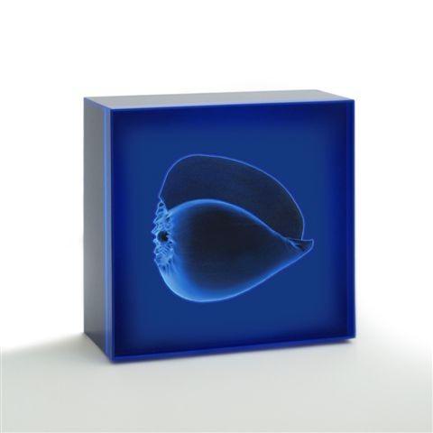 L'artista assumendo in sofisticata elaborazione le tecnologie del virtuale e del digitale recupera – con una operazione di alchimia moderna – l'essenza magica di alcune forme primarie, tutte affogate, intrise, immerse nelle variazioni minime della monocromia dell'azzurro. È infatti il suo mondo subacqueo. È un brivido blu.