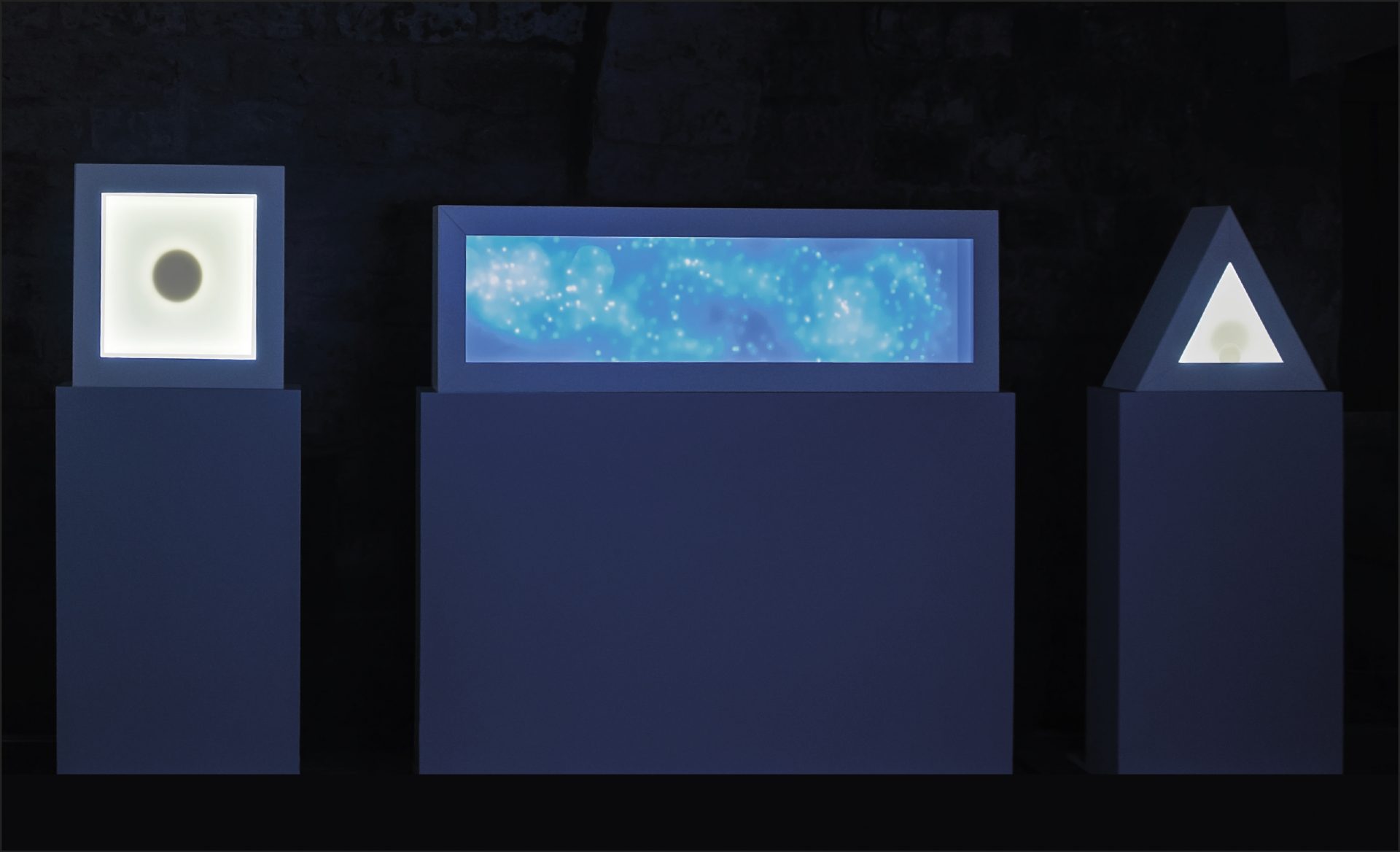 «Nella penombra del Bastione aragonese di Santa Scolastica – scrive Antonella Marino nel catalogo – nove strutture di essenziale geometria si stagliano con evocativo rigore in total white. Il candore assoluto delle teche in forma di spaziosi triangoli, cerchi, quadrati, sorretti in continuità da alti basamenti, contrasta in parte con l’ambiguità visiva delle immagini intrappolate al loro interno: apparizioni lattiginose di luce ora fredda ora più calda dai riverberi grigi e azzurri, da cui affiorano assonanze embrionali, traiettorie sfumate, sagome astrali, costellazioni fisse o pulsanti. Difficile descrivere ciò che gli occhi vedono e traducono in sorpresa mentale ed emotiva. In questa installazione Giulio De Mitri sembra voler condensare il processo originario della nostra esistenza, genesi cosmica, nascita, trasformazione, morte come continua rigenerazione. La silenziosa mistica sottende il mistero dell'eredità ancestrale: come è iniziato tutto? Che cosa è il creato? Qual è la nostra casa? Da dove è venuto tutto questo, in che modo ne facciamo parte?”, annota l'autore.»