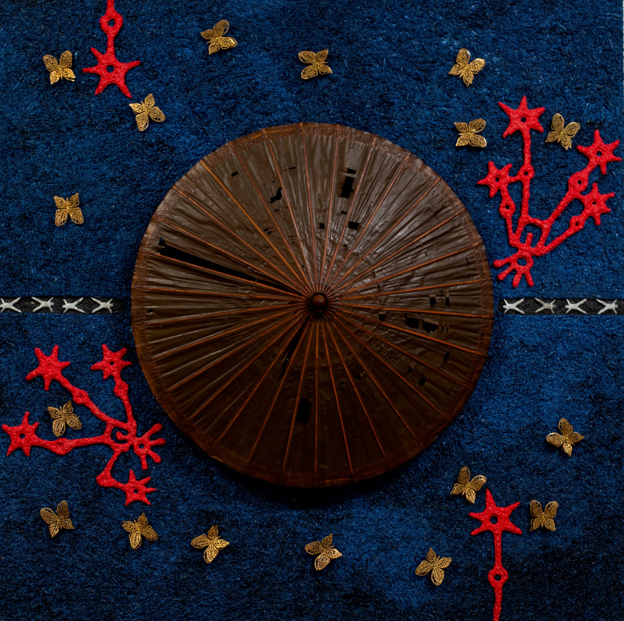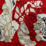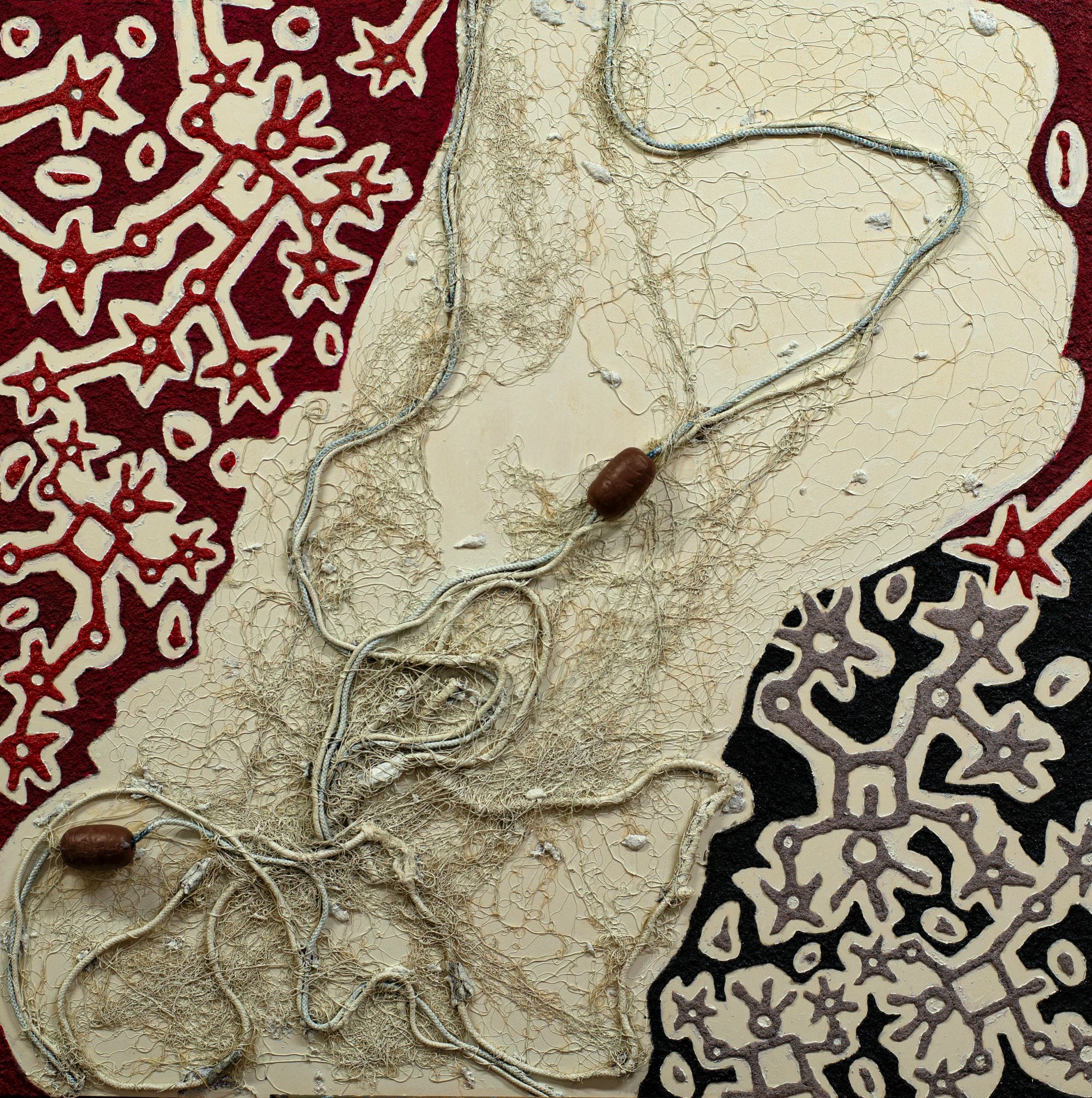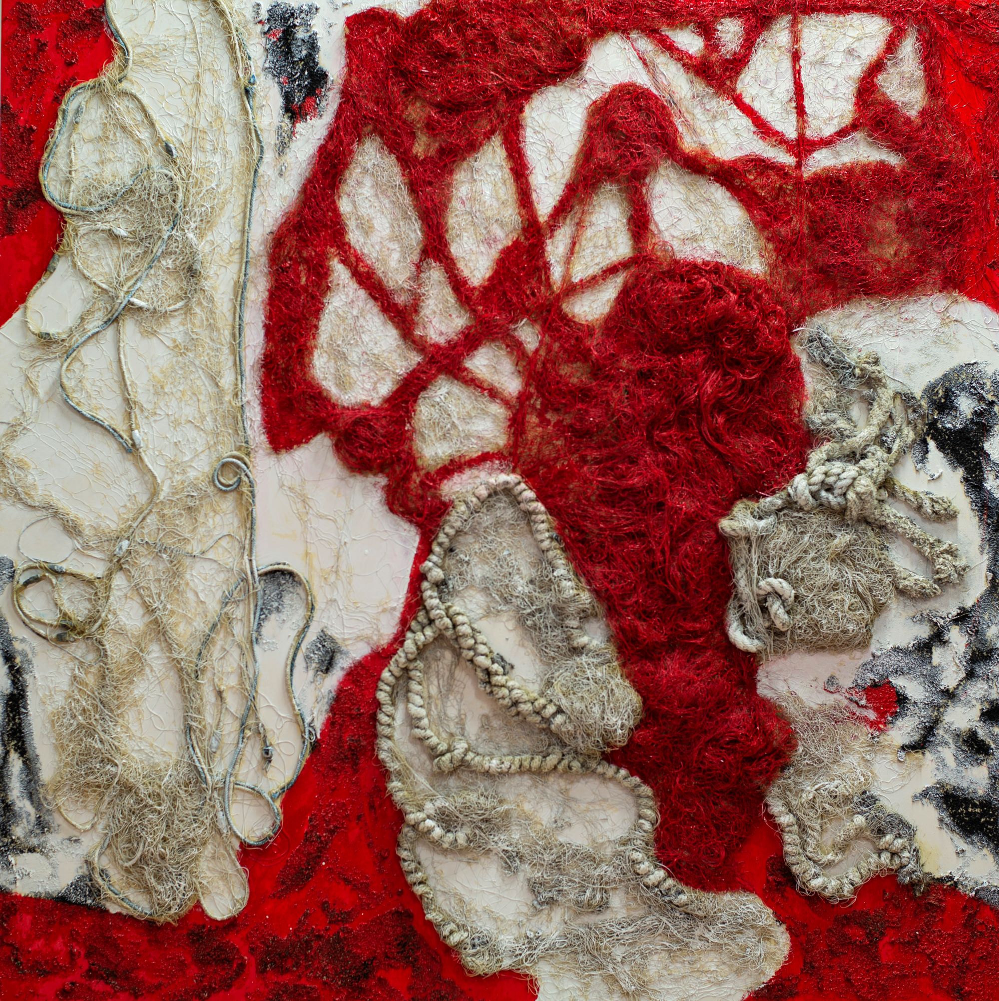 Possono leggersi in questa chiave anche la serie dei Girasoli, stilizzazione materico-pittorica di forme che ricordano il fiore e la sua collocazione nel paesaggio, ma anche il recente progetto con cui dalla terra Galgani passa al mare e alle “presenze” che lo connotano, come la rete da pesca, che in queste opere simboleggia dinamiche sociali e culturali, personali e collettive che imbrigliano vite, esperienze, rapporti, in una matassa inesplicabile. Reti che catturano, quindi, rappresentano un ostacolo, limitano la libertà, ma possono intendersi anche come un’opportunità di collegamento, un tramite per entrare in relazione con gli altri, con la realtà circostante, in maniera non virtuale ed effimera, ma reale e concreta, in un rapporto diretto con le cose. Le reti che Galgani applica sulla tela, mescolandole ad altra materia e colore, sono un modo per ricordarci – di nuovo il valore della memoria – che siamo tutti collegati, noi e gli altri, noi e la natura intorno, creature tra le creature, in connessione profonda con il vivente.