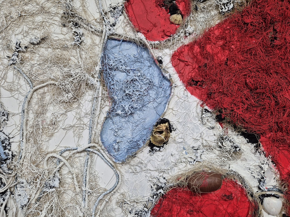 Per l’occasione Galgani presenta un ciclo inedito intitolato “Le reti”, in cui le reti da pesca recuperate dal mare diventano il supporto da plasmare o dove stendere la materia pittorica e creare nuove tensioni visive. L’opera simbolo della mostra, “Moby Dick”, campeggia sull’altare principale dell’ex chiesa benedettina, evocando la figura letteraria del cetaceo, simbolo della forza indomabile della natura e dell’ossessione dell’essere umano di raggiungere obiettivi più grandi di lui. Il percorso continua con altri lavori della stessa serie esposti nelle pareti laterali e con lo spazio destinato alle grandi maschere tratte dalla serie “Tri-bao”, in un dialogo incessante tra passato e presente, sacro e profano, storia e mito, tradizione e attualità.