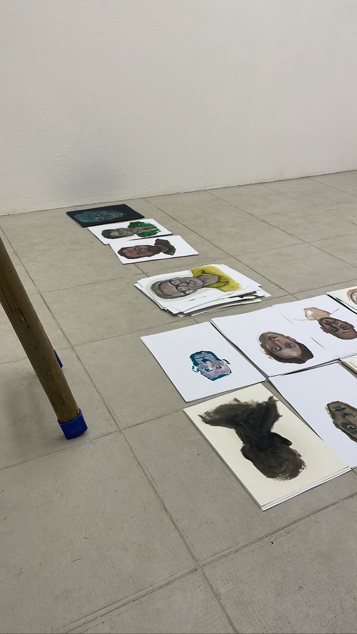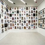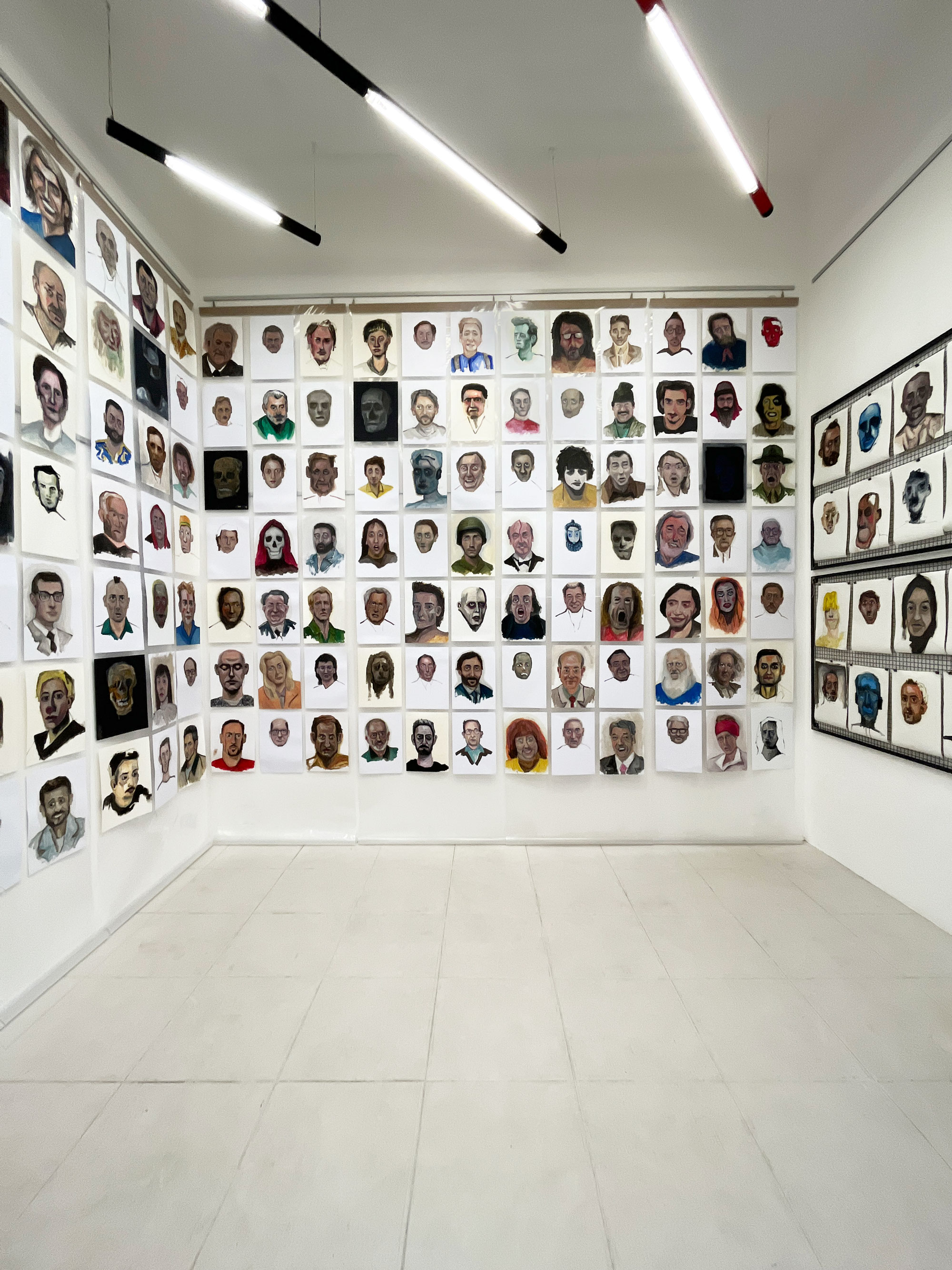 La mostra ha l’assetto di un cantiere, uno studio improvvisato in cui l’artista presenta “in rotazione” parte di questo monumentale work in progress iniziato nel marzo 2020. Da allora registra uno schedario di oltre 500 volti di persone reali e identità fittizie, in impressioni a olio su carta.