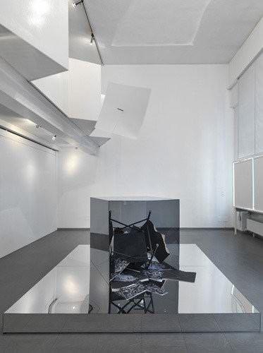 Tutti i lavori in mostra presentano superfici di formato quadrato, inteso come “dimensione generale, neutrale e perfetta, accolta come dato pre-esistente e immutabile, anche se di misura sempre diversa”. In La pietra filosofale, l'opera esposta nello spazio d’entrata della galleria, un foglio da disegno, trafitto al centro da una matita, è sospeso sopra un misterioso “mondo al buio”, allestito su una pedana di plexiglas specchiante (15 x 220 x 220 cm) e costituito da un cubo di plexiglas brunito (90 x 90 x 90 cm), dentro il quale una sedia da regista in posizione capovolta trattiene degli indecifrabili disegni su fondo nero. Nel secondo ambiente, Senza più titolo si compone, in modo similare, di volumi in plexiglas, in questo caso trasparenti e accostati su una pedana bianca: sopra i cubi (90 x 90 x 90 cm ciascuno), un colonnato in gesso di un tempio in costruzione o in rovina delimita uno spazio occupato da una piccola “cella” di plexiglas, presidiata ai vertici da quattro statue in miniatura di carabinieri in alta uniforme, nella quale sono custoditi dei frammenti di elementi pressoché impercettibili.