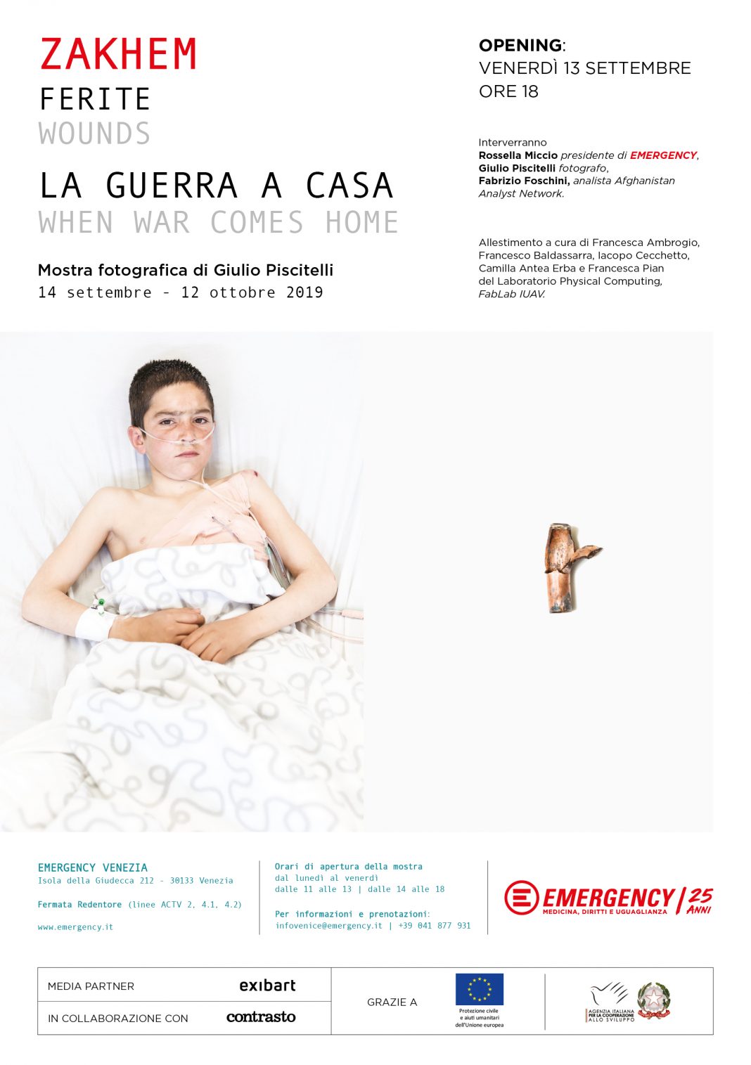 Dopo due prime esposizioni milanesi e un grande successo di pubblico, la mostra si sposta nella sede di EMERGENCY di Venezia (Isola della Giudecca 212), dove sarà inaugurata venerdì 13 settembre alle 18 alla presenza di Giulio Piscitelli, autore delle fotografie, Rossella Miccio, Presidente di EMERGENCY, e Fabrizio Foschini, Analista dell’Afghanistan Analysts Network. Con questo lavoro, EMERGENCY partecipa alla X edizione del Festival delle Arti della Giudecca e Sacca Fisola.