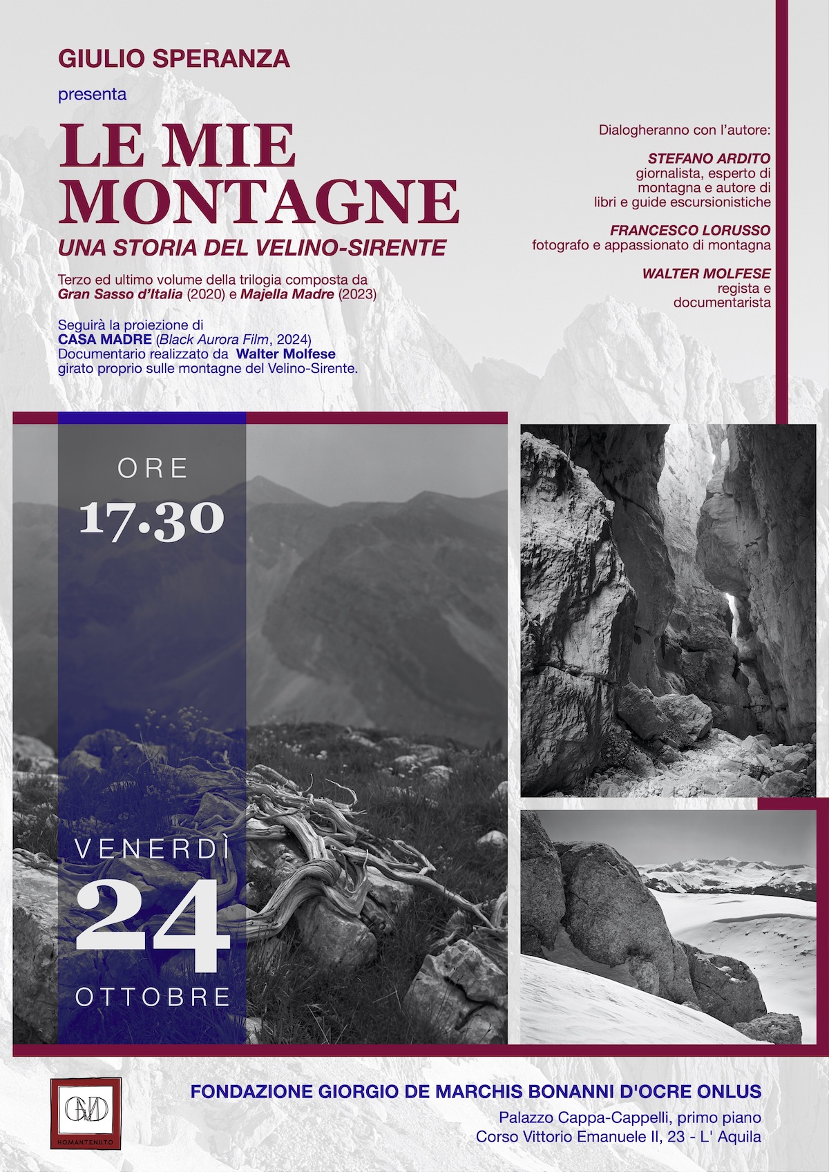 Venerdì 24 ottobre 2025 alle ore 17.30, la Fondazione Giorgio de Marchis Bonanni d’Ocre è lieta di presentare il libro Le mie montagne. Una storia del Velino-Sirente di Giulio Speranza, volume che chiude la trilogia composta delle altre pubblicazioni Gran Sasso d’Italia (2020) e Majella Madre (2023).