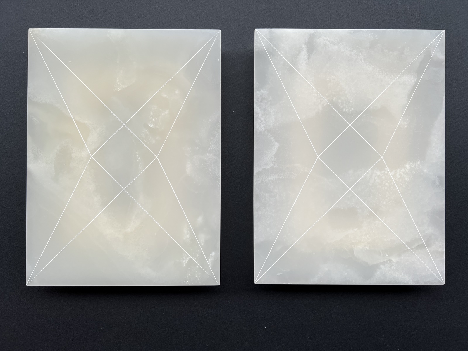 Due artisti di generazioni diverse, accomunati però dalla stessa attitudine multidisciplinare e da un forte dinamismo progettuale che si esprime con assoluta libertà per giungere alla costruzione coerente di un proprio codice formale, rimanendo sempre aperti al nuovo. È proprio questa straordinaria apertura alla modernità a far avvicinare Giulio Turcato al mondo della scienza. La sua passione per la biologia, la fisica, e l’astronomia guiderà tutta la sua produzione: dalla geniale creazione delle Superfici Lunari degli anni Sessanta, al tema dell’esplorazione cosmologica del cielo sviluppato negli Itinerari e negli Arcipelaghi degli anni Settanta, fino alle Acropoli e alle superfici luminose dei Cangianti. Un linguaggio in continua evoluzione che si rintraccia anche nella produzione di Vincenzo Marsiglia, a cominciare dalle prime opere in feltro, realizzate ritagliando e applicando la stella a quattro punte sulla superficie del quadro per creare sentieri e itinerari che somigliano a mappe cromatiche dalla cosmologia giocosa. Un escamotage con il quale l’artista si libera dalla pratica pittorica per “fare pittura” con altri mezzi: dalla scultura all’installazione digitale, ricercando rapporti ed equilibri sempre nuovi che cambiano con il variare della luce e stimolano l'interazione del fruitore.
