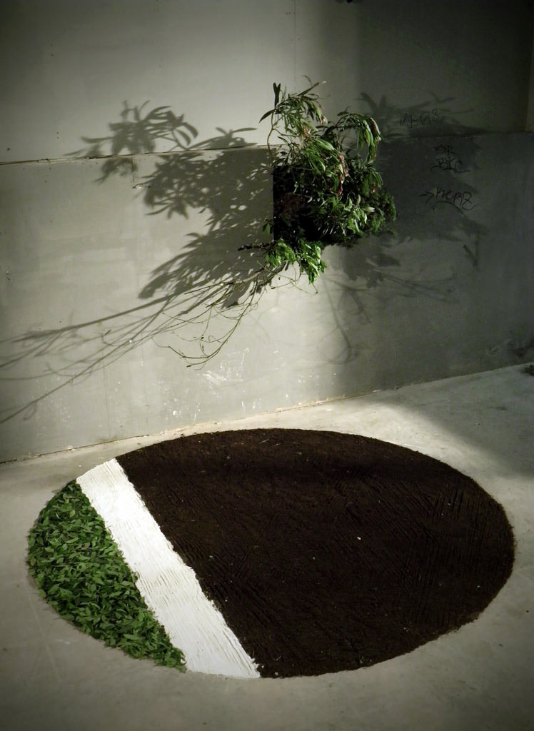 Utilizzando materiali organici quali farine, terra e legni, Vesprini crea forme geometriche e figure cromatiche perfettamente in simbiosi allo spazio.