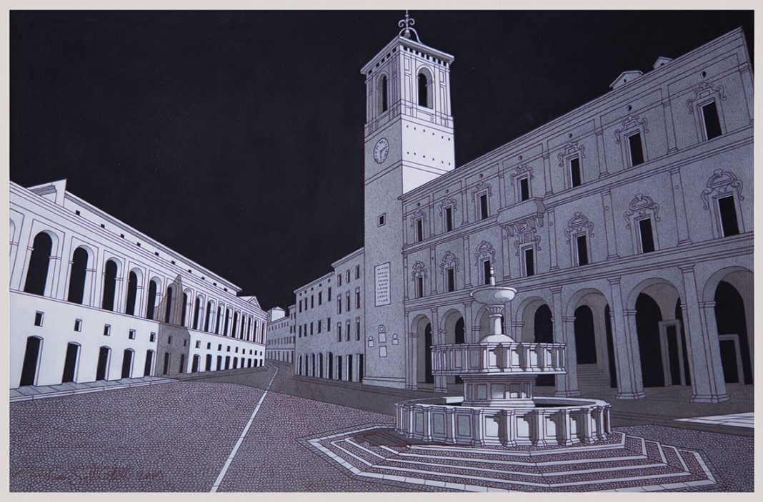 “volare alto per ritrovare le radici” è una mostra di disegni architettonici composta da quarantuno opere che, a tratto di matita, riconducono all’integrità originaria trentuno borghi medioevali delle Marche.