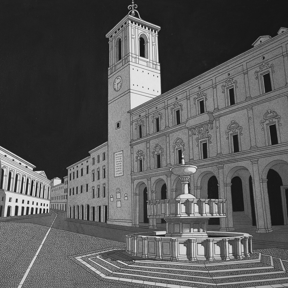 A tratto forte di penna e matita, Giuseppe Ansovino Cappelli realizza su carta Fabriano scenari architettonici essenziali e silenti di dechirichiana memoria di fronte alla quali respiriamo l’equilibrio e la grandezza di un pensiero collettivo.