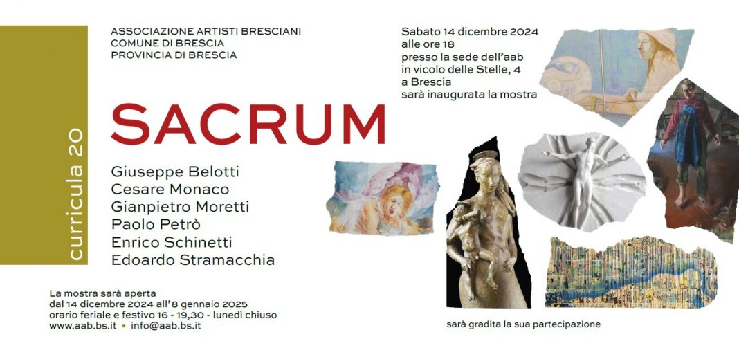 Nella sede dell'Associazione Artisti Bresciani – AAB, sito in Vicolo delle stelle, 4, Brescia, sabato 14 dicembre 2024 alle ore 18.00, sarà inaugurata la mostra: “SACRUM - Giuseppe Belotti, Cesare Monaco, Gianpietro Moretti, Paolo Petrò, Enrico Schinetti e Edoardo Stramacchia”.