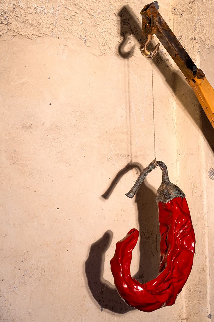 La scultura ha un ruolo altrettanto fondamentale nel corpus del suo lavoro. A testimoniarlo è l’imponente peperoncino in bronzo policromo che in occasione della mostra è collocato nello spazio antistante all’ingresso di Eataly: Capsica Red Light, questo il titolo dell’opera, con le sue grandi dimensioni (4,5 metri di altezza) e la sua immagine iconica e tradizionale, pop per la sua naturale cromia, sempre attuale e carica di simbolismi tipicamente italiani, introduce perfettamente al connubio, poi svelato all’interno, fra arte e cibo.