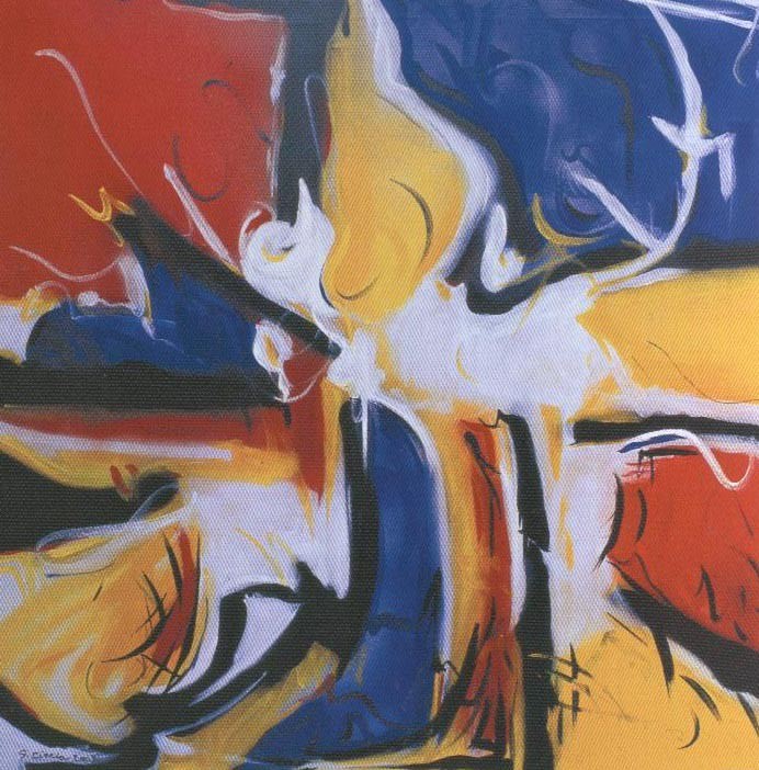 Il suo è un segno dirompente, autonomo, libero, che non ama definire le forme. Quest’ultime come fiamme occupano lo spazio costretto del quadro per avvicinarsi a un dialogo con altre forme provenienti direttamente dalla stessa materia cromatica.