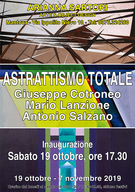 La Galleria Arianna Sartori di Mantova, nella sala di via Ippolito Nievo 10, presenterà la mostra del Gruppo Astrattismo Totale dipinti di Giuseppe Cotroneo, Mario Lanzione e Antonio Salzano, dal 19 ottobre al 7 novembre 2019.