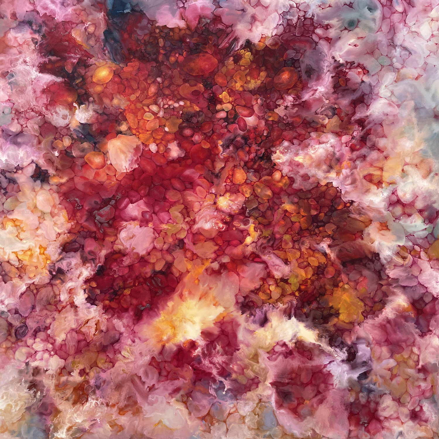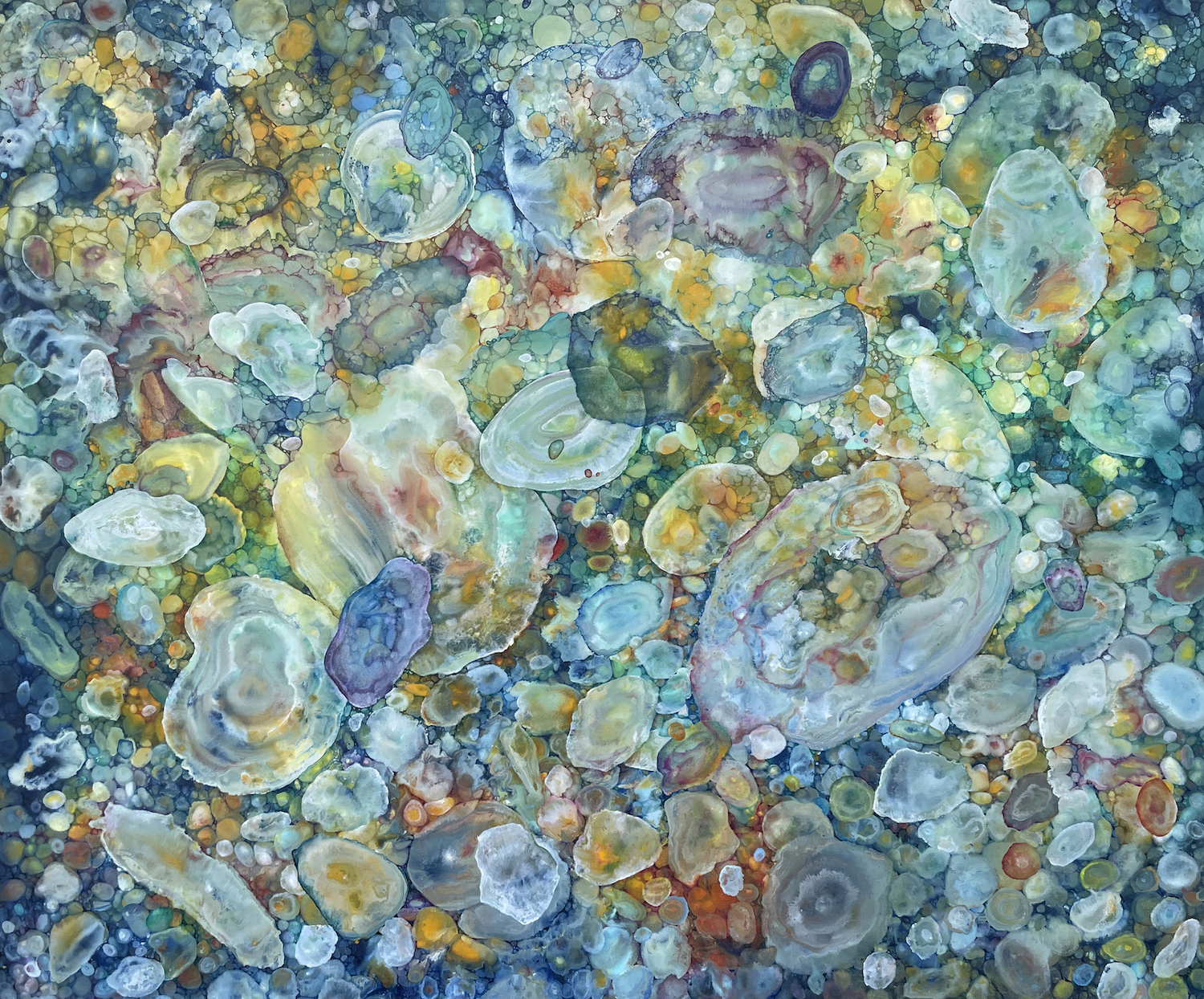 “L’interesse di De Fazio per le forme inorganiche dei minerali e per le strutture (organiche e inorganiche) di cristalli e rocce si è poi precisata ulteriormente a partire dagli anni Novanta, attraverso il passaggio a una pittura che azzerava ogni spunto iconografico per virare con verso una grammatica astratta, o meglio, apparentemente aniconica. Iniziavano, così, a emergere proprio in quegli anni gli elementi caratterizzanti di un linguaggio che ruotava attorno al rapporto tra il colore, la luce e geometria. Si registrava, insomma, nella sua pittura un piacere per i pattern e le trame ricorsive che prodotte dalle forze geofisiche sulla terra e, in particolare, sugli oggetti studiati nelle discipline della petrologia, mineralogia e gemmologia.