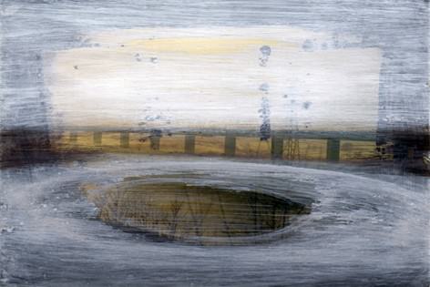 L’origine fotografica di queste tecnopitture, stampate su impeccabili lastre di alluminio, è smentita da una apparente stratificazione pittorica, risultato di un lungo processo di contaminazione tra manualità e tecnologia. Stesa a lunghe pennellate, quasi strusciata sulla superficie fotografica, la “pittura”, con il bianco e il nero, lascia trasparire negli squarci di una atmosfera brumosa frammenti di paesaggi noti, quotidianamente attraversati, ma che ora ci appaiono come archeologie di una civiltà scomparsa. Ma è da sottolineare come ciò si rivela nel linguaggio, l’immagine finale è di una pittura visivamente presente ma materialmente assente, senza le asperità, i solchi del pennello. La superficie e perfettamente liscia, fredda, un oggetto ultra tecnologico dove la manualità pittorica e il calore della materia sono solo recuperati ed esposti come reperti.
