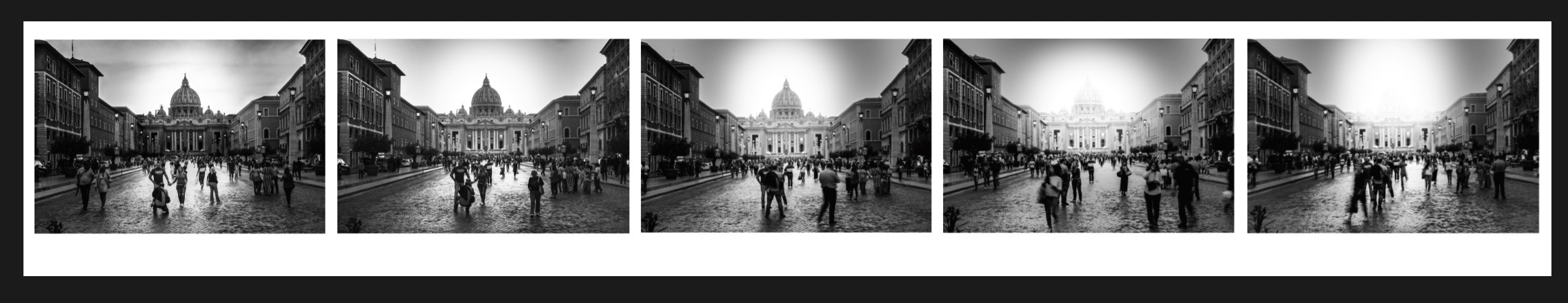 A distanza di tre anni Di Piazza ritorna in Piazza di Pietra con un nuovo progetto fotografico interamente dedicato a Roma e composto da tre parti. La scomparsa della Basilica di San Pietro nella luce, un’installazione fotografica di tre metri, secondo tempo di un lavoro presentato a Milano e a Firenze quattro anni fa dal titolo “Dissoluzione Duomo”, centrato su Milano.