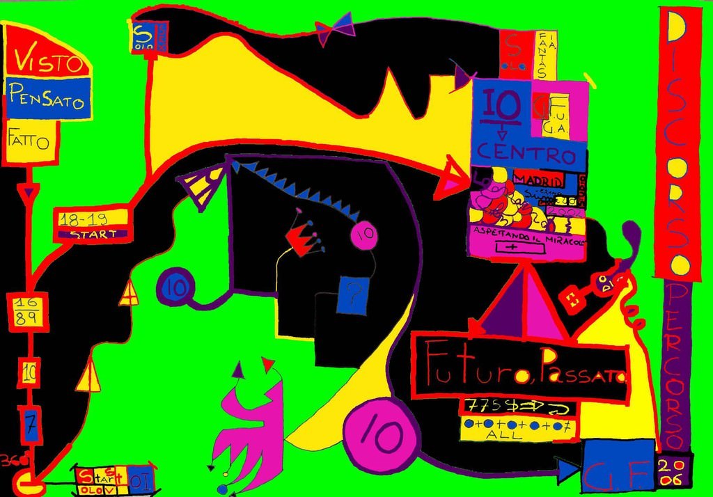 È la sublimazione del viaggio - attraverso di-segni-colori-scritture - che indaga un ideale punto di equilibrio tra armonia e caos, tra presente e passato.