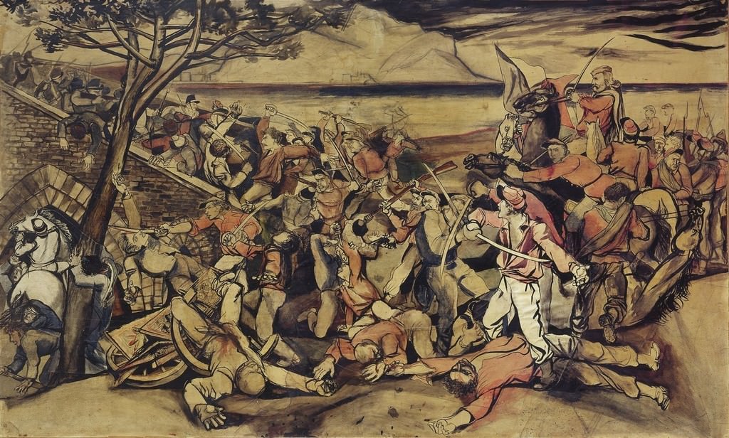 Divisa in quattro sezioni, la mostra “Giuseppe Garibaldi e i Mille: dalla realtà al mito” è costruita secondo un percorso cronologico e tematico che offre al pubblico la rappresentazione dell’Eroe dei due mondi attraverso una iconografia d’autore di alto livello ma anche di quella più popolare, a testimonianza della forte presenza di Garibaldi nell’immaginario collettivo. A confronto, dunque, i molti volti degli infiniti ritratti di Garibaldi realizzati nelle diverse epoche. Nell’800 con la pittura realista rappresentata dai dipinti di Giovanni Fattori, di Gerolamo Induno ( “Un grande sacrificio”) e dalla scultura di Adriano Cecioni (“Garibaldi”, gesso colorato), fino all’interpretazione celebrativa di Vittorio Corcos che nel suo “Ritratto di Giuseppe Garibaldi” datato 1882, anticipa la stagione dei grandi monumenti dell’eroe su molte delle piazze italiane , Livorno compresa. E poi il simbolismo del ‘900 : in rassegna un’opera di importanza capitale per la mitologia del risorgimento, il “Garibaldi” di Plinio Nomellini del 1906 di proprietà del Museo Fattori. L’opera, che godette di grande fama fin dalla sua prima esposizione alla biennale di Venezia del 1907, è un’evocazione dell’epopea garibaldina e la trasposizione in chiave di mito della figura del Generale. Ancora ‘900 con il grande Guttuso che in pieno neorealismo ha fatto di Garibaldi l’eroe dei suoi quadri più belli. Di Renato Guttuso sarà in mostra uno studio d’insieme dell’opera monumentale La Battaglia di ponte dell’Ammiraglio realizzata nel 1951, gentilmente concesso dal Gruppo Parlamentare PD della Camera dei Deputati.