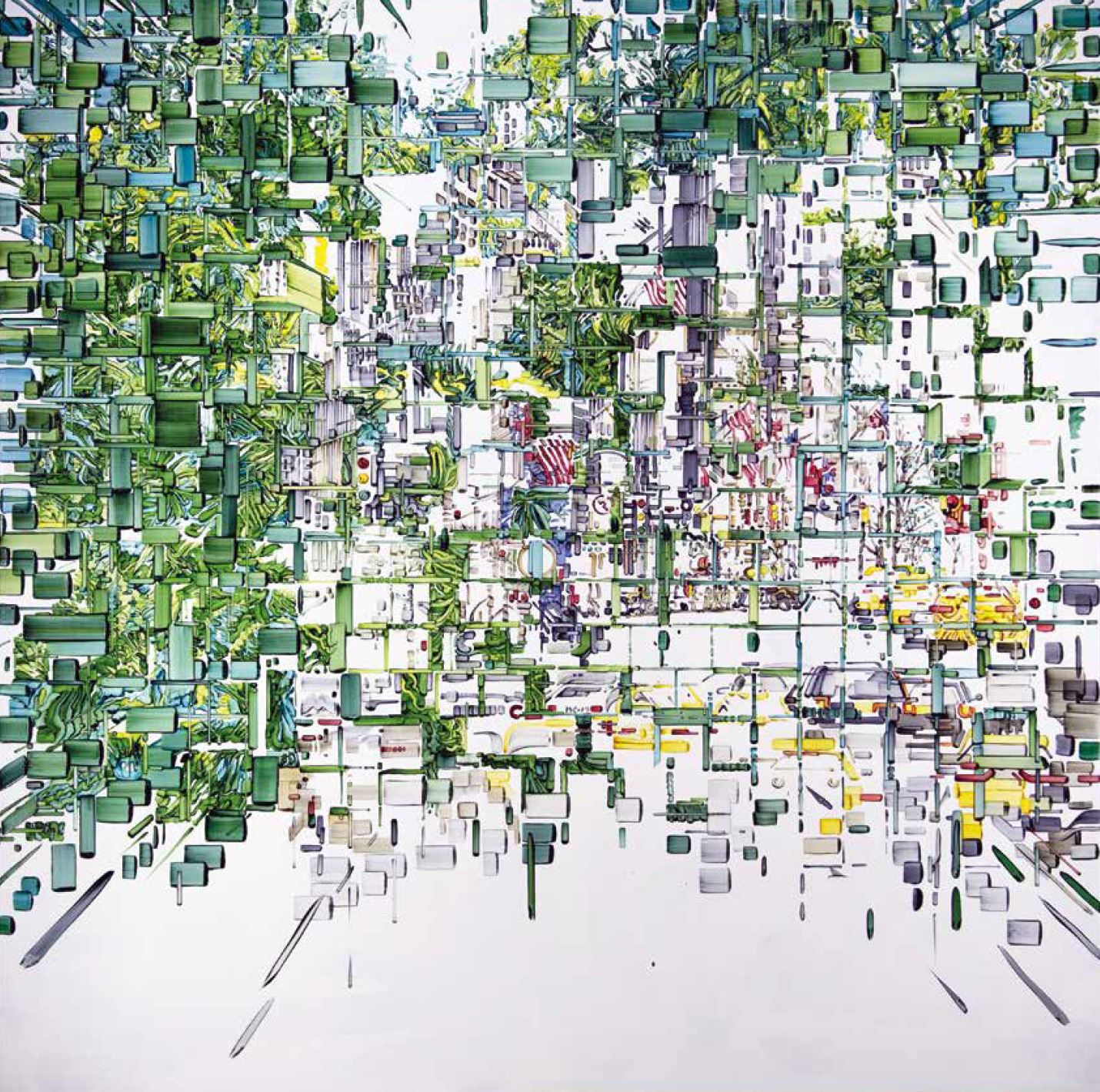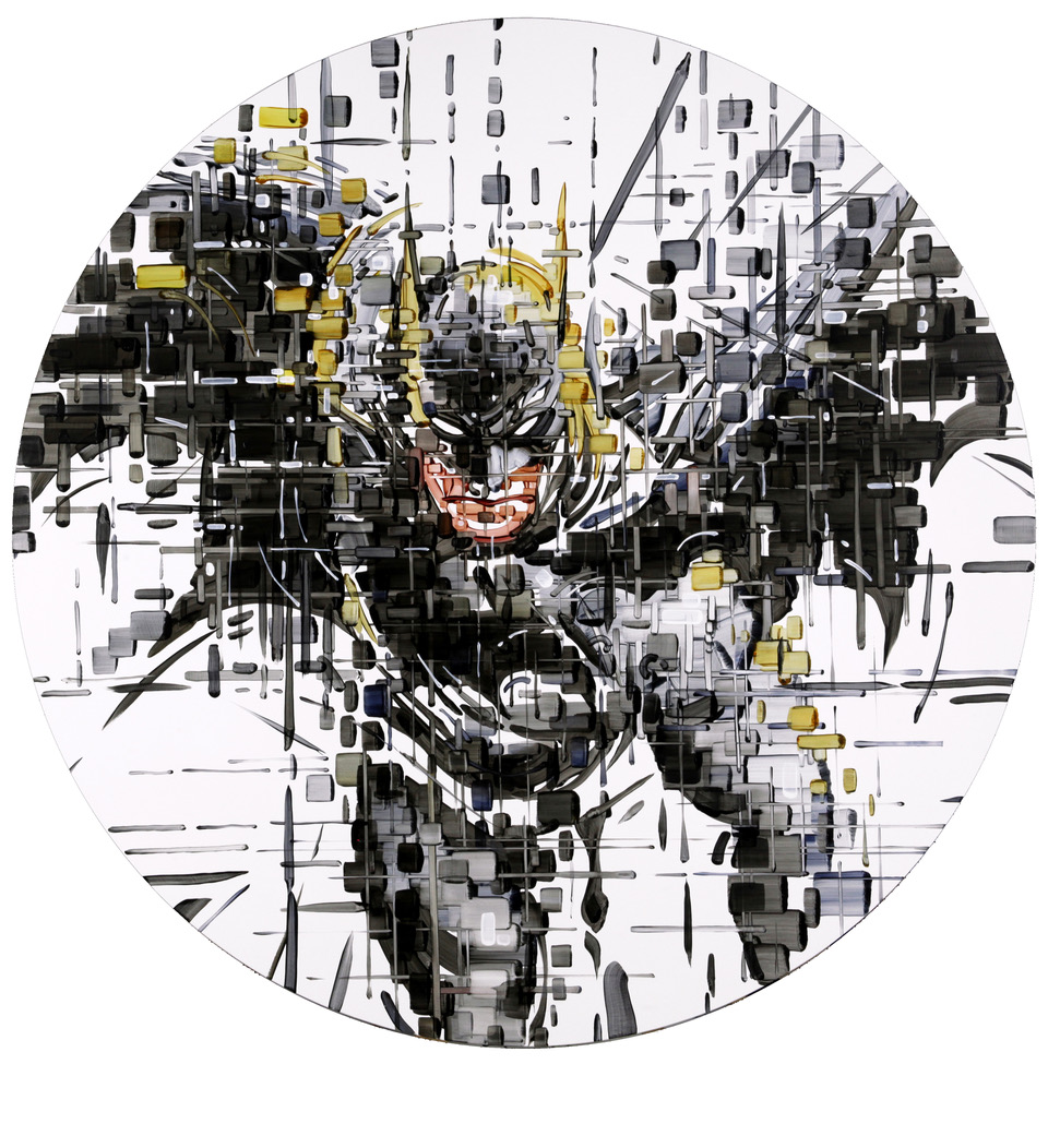 convoglia l’attenzione dell’osservatore su un centro guida, che è molto di più di un punto di fuga, che poi si sgretola in un’esplosione di frammenti simili ai pixel riportandoci di colpo alle immagini offuscate e banalmente poco nitide degli anni Ottanta, in un retropercorso che però assume sempre più nitidezza mano a mano che l’osservatore mette a fuoco la nuova evoluzione visiva. Si entra cioè a pieno dentro le sue opere, nella sua controversa e affascinante Matrix, tra turbamenti e riflessioni, spazi vuoti e riempimenti, e attraverso i suoi ‘codici’ che racchiudono il senso del caos, si tocca con mano l’eleganza e la raffi natezza del suo stupefacente senso pittorico. Le sue opere sembrano dipinte su un monitor di ampie dimensioni. O sembrano prodotte dalla tecnologia stessa, come se una non troppo futura AI disgregasse volontariamente in milioni di pezzi le nostre certezze, le nostre basi, le cementifi cate vicende della nostra storia passata”.