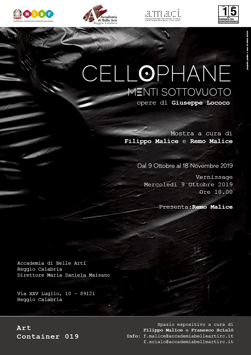 L’Accademia di Belle Arti di Reggio Calabria diretta dalla Prof.ssa Maria Daniela Maisano è lieta di ospitare la mostra personale dello scultore Giuseppe Lococo, il nuovo evento intitolato “Cellophane menti sottovuoto” è curato da Filippo Malice e Remo Malice contemporaneamente coordinatori dei Dipartimenti di Arti Visive e di Comunicazione e Didattica dell’Arte.