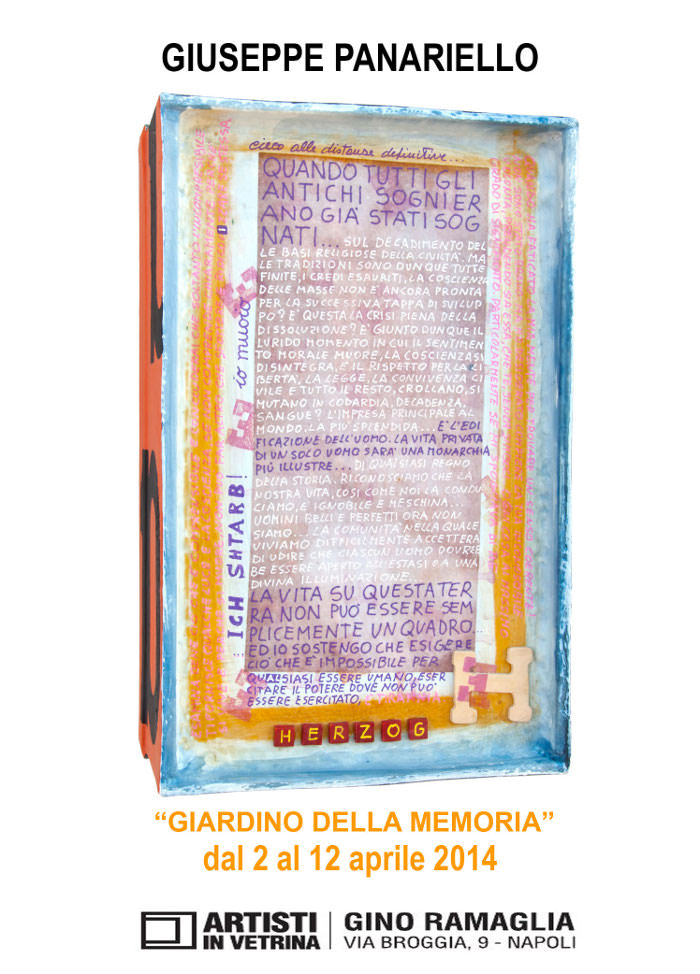 non solo un supporto inedito, la scatola, ma anche tecniche e materie prime, frutto di uno sperimentalismo avanguardistico e di una dinamica di riciclaggio, entrambi con un significato ben preciso. Nelle opere di Panariello, difatti, la materia, anche quella apparentemente meno 'nobile', assurge a vero e proprio tramite espressivo e creativo”. E si potrebbe chiudere questo breve comunicato citando Cartesio: …