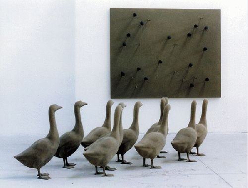 La sabbia, che ricopre e cristallizza ogni opera, è la costante del suo lavoro: « è un elemento che mi ha sempre attratto – afferma l’artista - nell’immaginario comune essa tende a ricordare le prime manipolazioni infantili; […] la fragilità (castelli di sabbia) e la mutabilità continua dovuta agli agenti atmosferici ». La sabbia allude al senso ludico, all’eterna trasformazione, alle ideologie effimere sulle quali a volte la società costruisce le proprie basi.