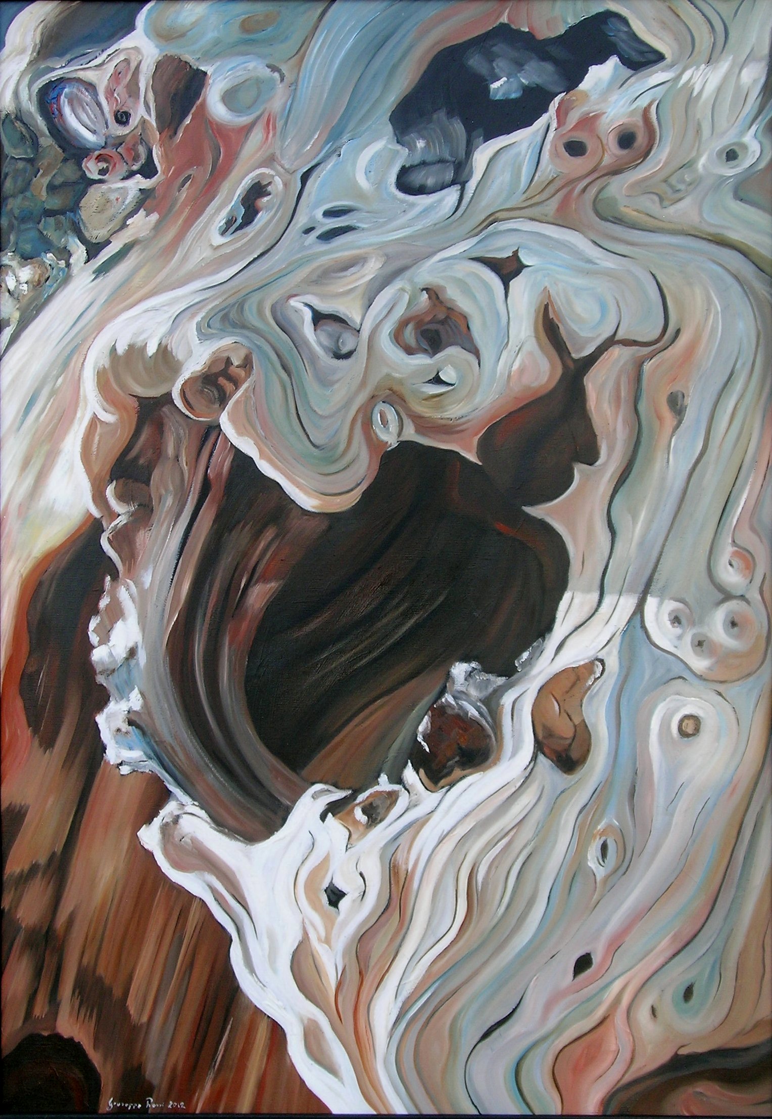 Come scrivono i curatori nei testi in catalogo : “ Quella di Giuseppe Rossi è una pittura vigorosa ed energetica che crea tronchi antropomorfi di grandi dimensioni attraverso stratificazioni materiche che amplificano la visione, nei quali talvolta si rintracciano le sembianze di una deformazione del volto umano o di altre figure. L'artista costruisce, attraverso una densa pennellata di colore, percorsi tortuosi che alternano buchi neri nei quali ci si può immergere come in un pozzo senza fondo e parti di corteccia sbrecciata che si contorcono tra loro come sofferenti, portando alla luce i pensieri nascosti nei meandri più oscuri della mente, mentre la gamma cromatica di colori - che non sono affatto reali ma frutto di un'elaborazione fantasiosa che non corrisponde alla realtà - contribuisce a far affiorare sensazioni legate agli stati d'animo percepiti.” (Francesca Baboni)