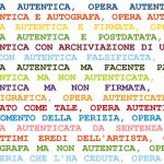 Conclude il percorso espositivo la serie di opere progettate per la quarta mostra irrealizzata dal titolo Autografo ma non autentico, in cui Tubi, riprendendo una soluzione già usata nei primi anni Novanta in opere come Terrorist.txt o Virus.txt, compila un elenco di espressioni e lemmi riferiti al mercato dell’arte, riconducibili allo stesso campo semantico dell’autenticità, nozione ritenuta un valore indispensabile per decretare la fortuna critica di un’opera e soprattutto la sua valorizzazione in termini culturali ed economici. La serie ha una gestazione lunga: iniziata nel 1994, come omaggio ad Alighiero Boetti appena scomparso, è stata più volte rielaborata nel corso del tempo ed è presentata qui nella sua veste definitiva. Il progetto si presenta come una tassonomia che critica l’eccesso di tecnicismi e i paradossi del linguaggio burocratico diffusi nel mercato dell’arte e soprattutto riflette sullo statuto ambiguo del limite tra vero e falso.