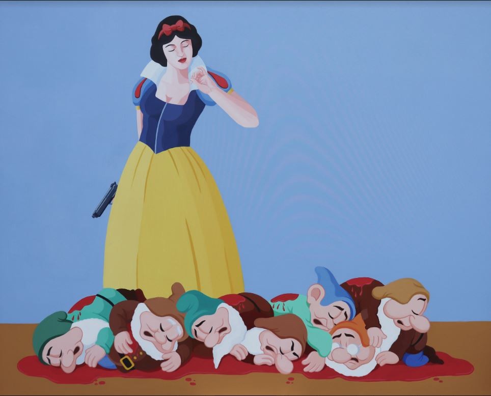 sado-maso; o uccide i sette nani colpendoli con una pistola alle spalle, e duplica il suo volto con l’immagine della crudele regina, mostrando nel contempo, con un colpo d’anca, la coscia ignuda”.