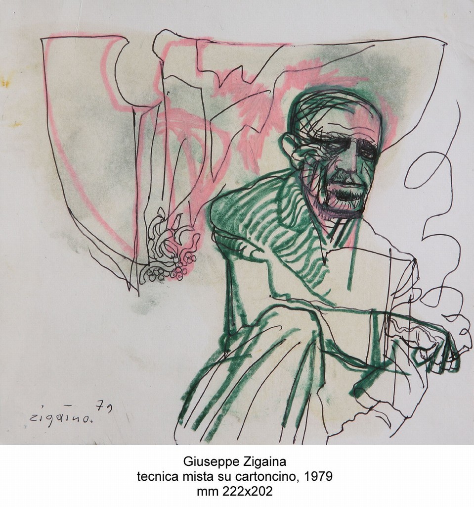 Le opere in mostra – scrive Accerboni - testimoniano in sintesi il significato dell’evoluzione del linguaggio di Zigaina nell’ultimo quarantennio, sottolineando la sua non comune capacità di far danzare il segno pittorico e grafico secondo un ritmo contemporaneo, denso di energia, di tensione, di capacità interpretativa e di soluzioni inedite, raggiunte attraverso il significativo assemblaggio di più tecniche e mezzi espressivi. I lavori esposti transitano infatti dalle felici, essenziali e personalissime rappresentazioni del paesaggio, della natura e dei suoi misteri - visti anche in rapporto all’uomo e perciò intrecciati alla sua anatomia - ad alcuni momenti del ciclo intitolato Mio padre l’Ariete, scandito da intense cesure e interventi grafici.