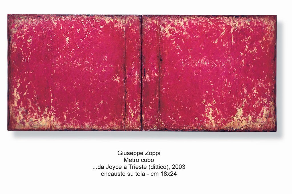 Come i grandi intellettuali e gli artisti del Nord compivano nel secolo scorso, sull’esempio di Goethe, il viaggio in Italia, così Zoppi, affascinato da Trieste, ne ricerca ripetutamente le atmosfere, attraverso i “santuari” della vita di Joyce, e ne riproduce l’essenza e il pathos in opere monocromatiche, realizzate attraverso la raffinata e laboriosa tecnica dell’encausto, una miscela di pigmenti e cera molto diffusa nel mondo antico. Il pittore procede per “concetti cromatici”, che, in seno alla poetica informale, ci accompagnano in modo criptico ed elusivo ma al tempo stesso sostanziale, nella Trieste delle case chiuse d’inizio secolo (il “Metro cubo”, la “Chiave d’oro”), davanti alle bianche persiane della locanda di via S. Nicolò, ultima dimora dell’inquieto scrittore, e a quelle, leggermente venate d’azzurro, della casa di riposo di Gorizia, dove trascorse i suoi ultimi anni in solitudine Annie Schleimer, uno degli amori intatti di Joyce, mentre bianca e appena venata di rosa è la verginità di Amalia Popper, altra fanciulla dell’alta borghesia, attratta dall’irlandese. Azzurra, ma più intensa è la rappresentazione dei Bagni Fontana, stabilimento balneare della Trieste fin de siecle che fu chiuso proprio nel 1904.