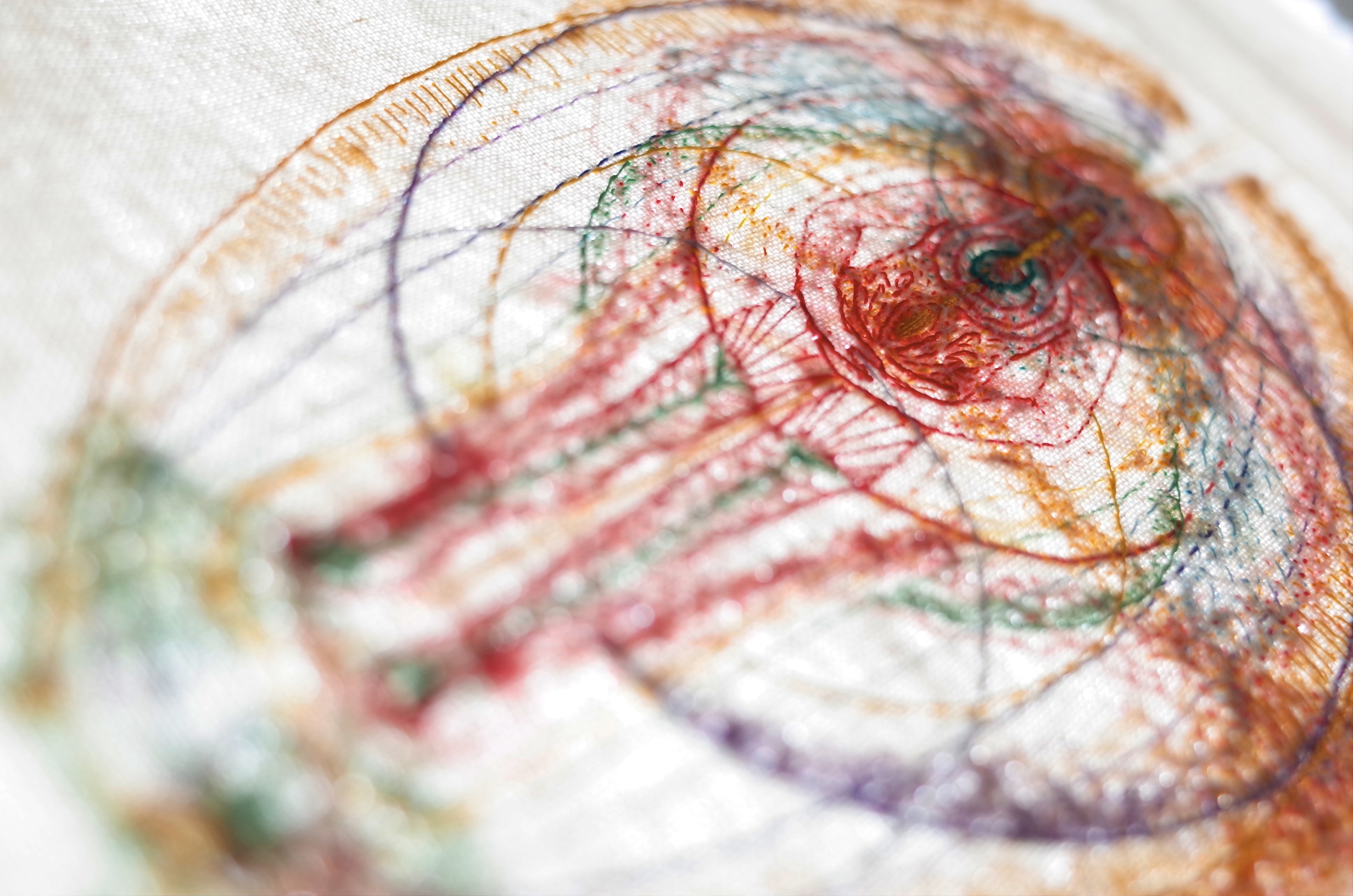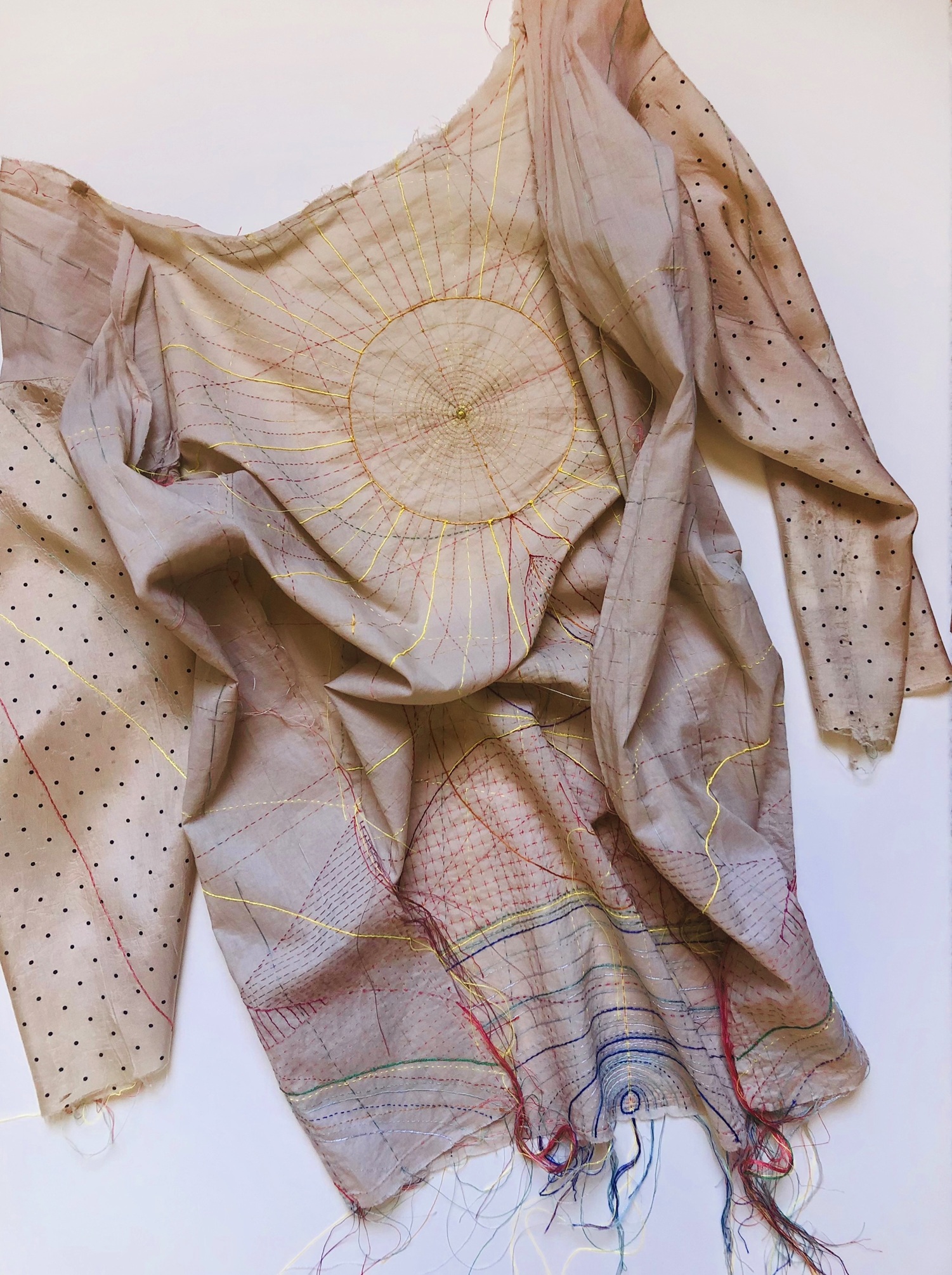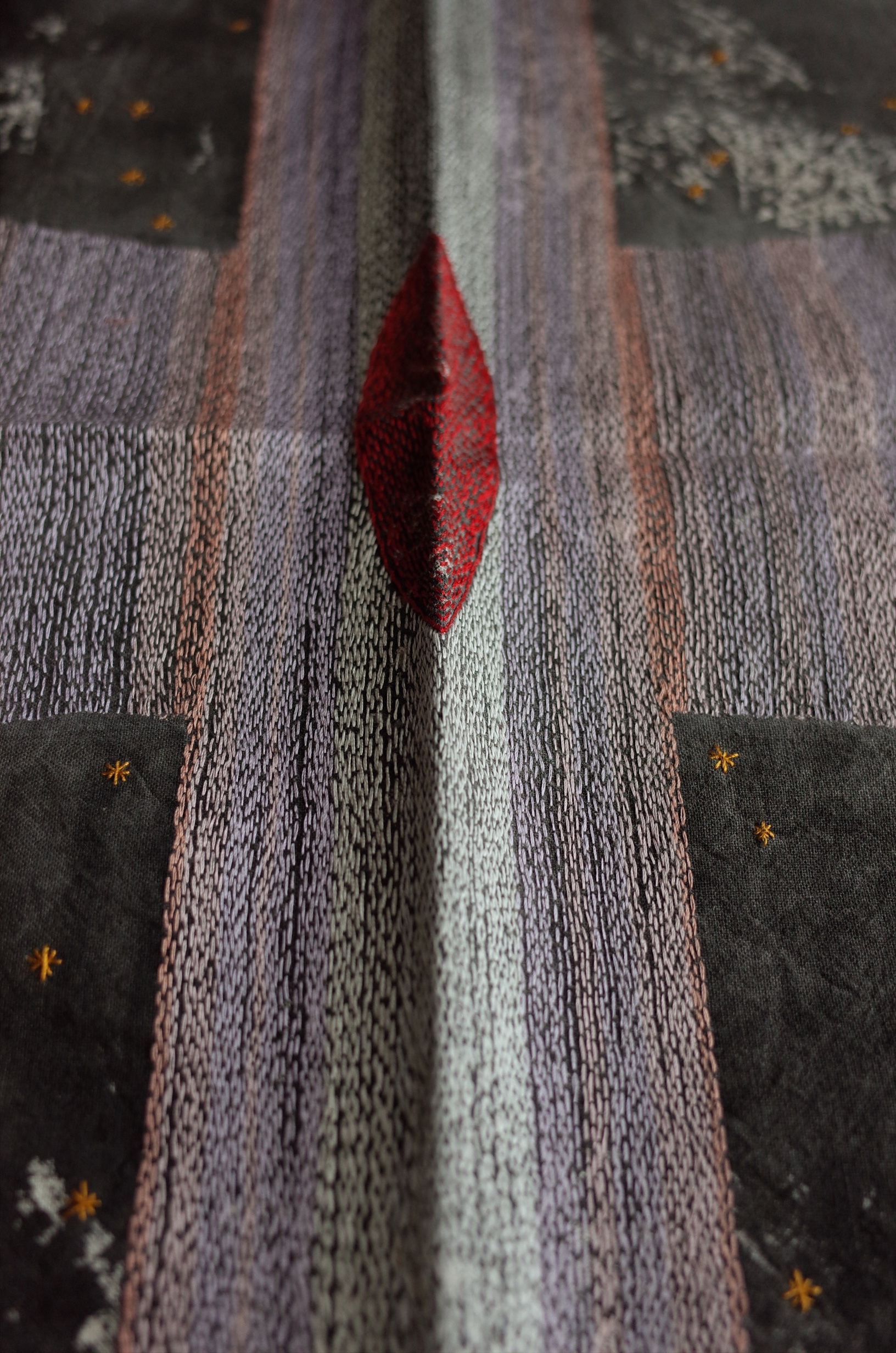 Una delle fonti di ispirazione più ricorrenti per Giuseppina è il semamori, un antico tipo di ricamo giapponese praticato principalmente durante il periodo Edo. Questo ricamo, con funzione apotropaica, è un esempio di come l'arte del cucito possa assumere significati profondi e spirituali. Le madri giapponesi, ricamando queste cuciture sul retro dei kimono dei loro bambini, non solo li proteggevano, ma creavano un legame culturale e simbolico con le nuove generazioni. Giuseppina si è lasciata affascinare da questa tradizione, riconoscendo in essa la forza magica del cucito, un atto che diventa un talismano e un mezzo di connessione con il Sacro.