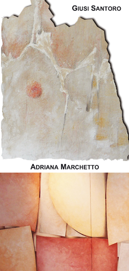 Nei dipinti di Adriana Marchetto "libere geometrie "donano respiro all'universo tramite ricercati percorsi geometrici dove la forma ellittica ad intreccio diviene il leit-motive delle composizioni. Gialli, ocra, ovattate degradazioni violacee diventano il paradigma delle figurazioni, dove la linearità prevedibile delle geometrie viene piegata dalla dinamicità temporale degli eventi. Energie primordiali si scontrano in spazi cosmici improbabili, definiti da silenti volute che improvvisamente si trasformano in roteanti cerchi dall’immensa espansione. Affiora nelle opere di Giusi Santoro e Adriana Marchetto una sensibile tensione verso la luce, il rigore esecutivo, la ricerca di infinito generando affinità formali, colte convergenze espressive, rigorose razionalità figurative, unite ad un profondissimo ed evocativo lirismo rappresentativo .