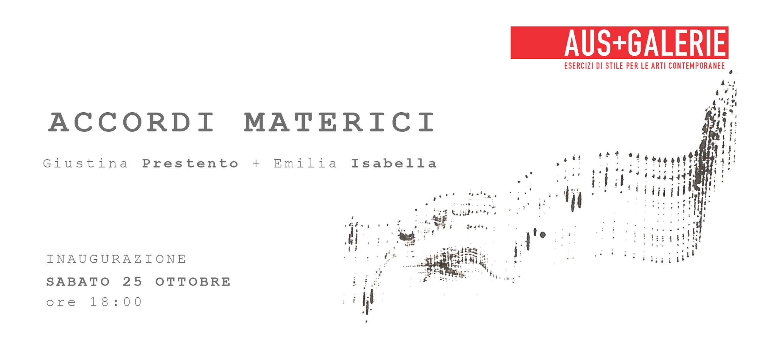 Aus+Galerie riapre la stagione espositiva con una doppia personale dedicata a Giustina Prestento e Emilia Isabella dal titolo Accordi Materici che propone agli spettatori una ricca serie di opere inedite lavori su carta, sculture, dipinti, libri e video.