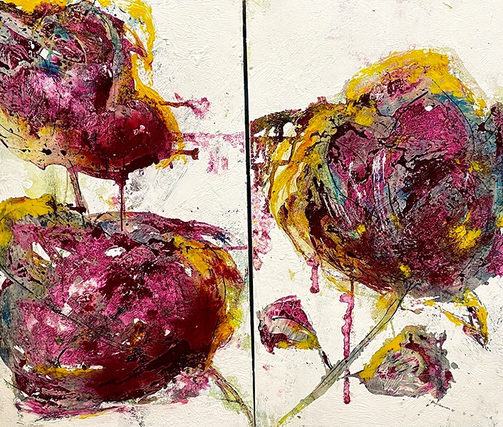 Circa una trentina le opere in mostra suddivise tra formati imponenti e piccoli formati, in acrilico, smalto e resina, il segno distintivo dell’artista, dove il colore e i contrasti creano un gioco di chiari e scuri nelle tele dalle quali sbocciano elementi floreali policromi, più o meno accentuati.