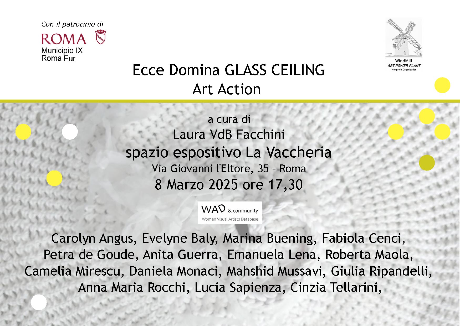 La manifestazione avrà al suo interno eventi di grande interesse come l'Art Action Ecce Domina Glass Ceiling, che si svolgerà proprio in occasione dell’inaugurazione della mostra e alla quale parteciperanno le artiste:
