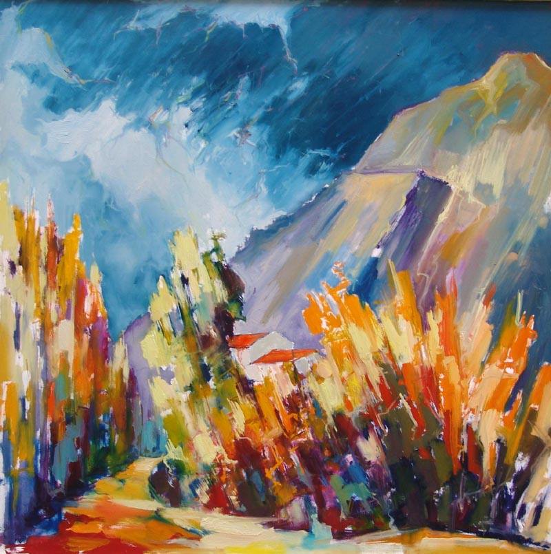 Glauco Barlecchini preferisce usare subito il colore; le sue scelte cromatiche cadono sempre sulle tonalità primarie,rossi, gialli, blu, e nella loro fusione non vi è traccia del nero.