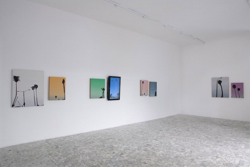 La seconda personale di Glen Rubsamen alla Galleria Alfonso Artiaco raccoglie “15 piccoli dipinti di paesaggi dai colori luminosi che si dispongono sui muri della galleria tutti seguendo la stessa linea d’orizzonte, in coppia oppure in gruppi da tre oppure ancora in coppia con un monitor che riproduce lo stesso soggetto. Palme e Lampioni. Le palme e i lampioni fuoriescono dagli angoli dei dipinti, in basso, creando una composizione di insieme complessa che sfida qualsiasi senso di prospettiva e punto di vista. Le pitture producono un paesaggio che diviene un surrogato della percezione del tempo: il giorno si trasmuta in notte, l’estate in inverno, e l’antico in moderno. La composizione delle immagini suggerisce anche una variabilità arbitraria, potendo una stessa immagine facilmente essere scambiata con un’altra in una sequenza in progressione. I lavori hanno titoli che richiamano un indice, dalla lettera “A” alla “O”, e danno l’impressione di una elaborata equazione matematica generando dalla somma il caos. Questo caos è formalizzato dai ‘quasi’ colori primari contrapposti alla pura calma e tranquillità, quasi come uno stato realista di trance mantrico” (Glen Rubsamen)