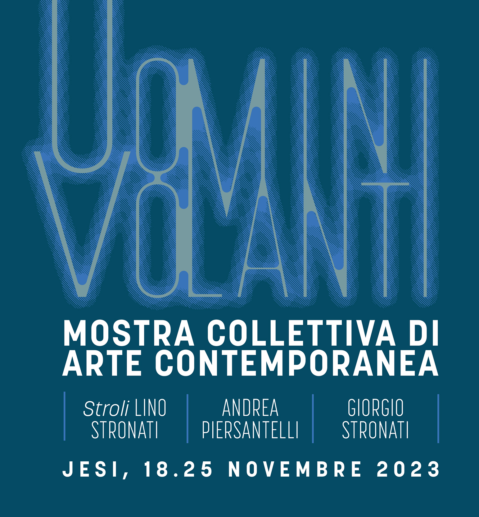 Uomini volanti è il titolo e il tema ispiratore di una mostra collettiva che unisce il lavoro di tre artisti: Lino Stronati in arte Stroli, Andrea Piersantelli e Giorgio Stronati.