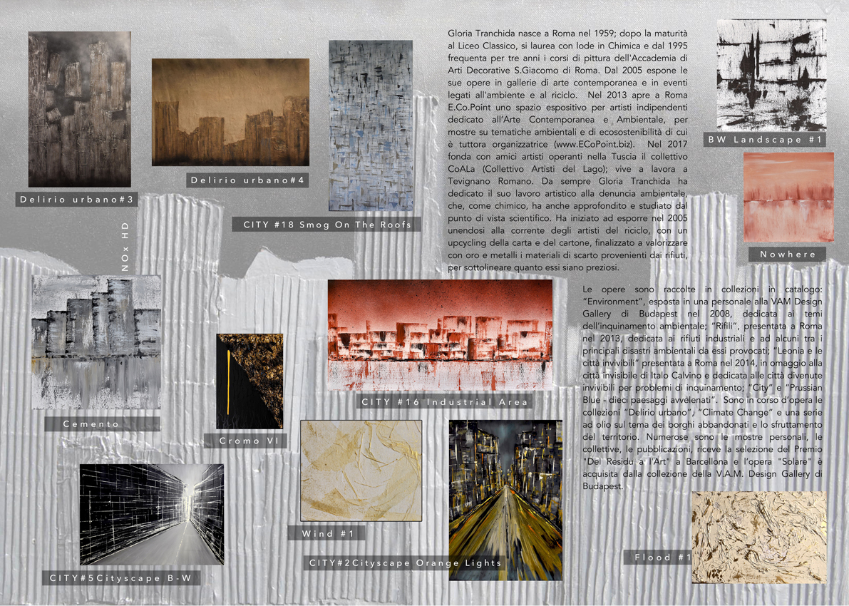 Le opere sono raccolte in collezioni in catalogo: “Environment”, esposta in una personale alla VAM Design Gallery di Budapest nel 2008, dedicata ai temi dell’inquinamento ambientale; “Rifili”, presentata a Roma nel 2013, dedicata ai rifiuti industriali e ad alcuni tra i principali disastri ambientali da essi provocati; “Leonia e le città invivibili” presentata a Roma nel 2014, in omaggio alla città invisibile di Italo Calvino e dedicata alle città divenute invivibili per problemi di inquinamento; “City” e “Prussian Blue - dieci paesaggi avvelenati”. Sono in corso d’opera le collezioni “Delirio urbano”, “Climate Change” e una serie ad olio sul tema dei borghi abbandonati e lo sfruttamento del territorio. Numerose sono le mostre personali, le collettive, le pubblicazioni, riceve la selezione del Premio "Del Residu a l'Art" a Barcellona e l’opera "Solare" è acquisita dalla collezione della V.A.M. Design Gallery di Budapest.